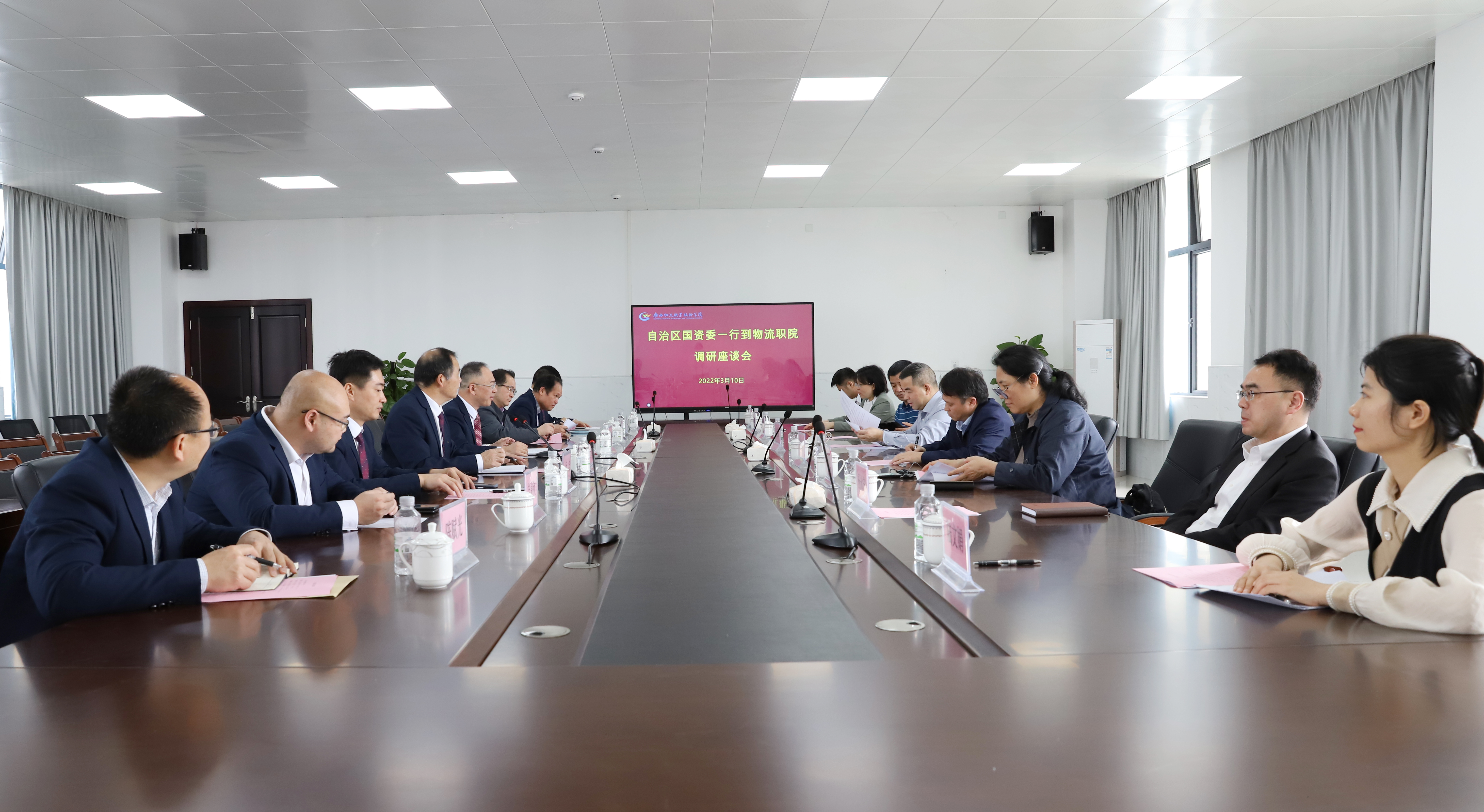 自治区国资委法规处、改革发展处、法人处理处负责人,集团公司党群工作部负责人,贵港市国资委党委书记、主任禤间萍陪同调研。学院领导班子成员,学院党政办公室、党委组织部、教务处负责人参加座谈会。
