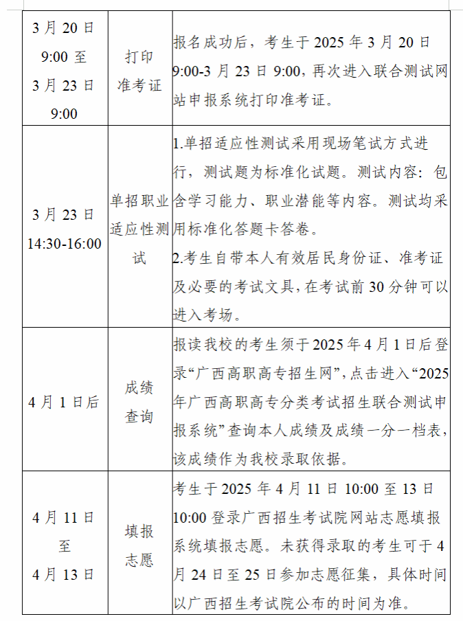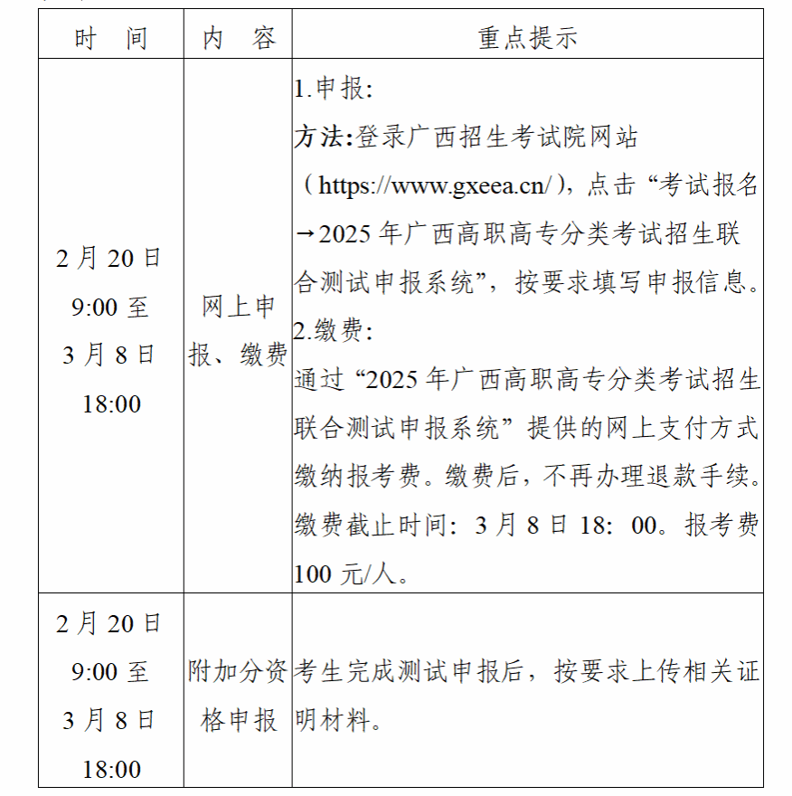 方法:登录广西招生考试院网站(https://www.gxeea.cn/),点击“考试报名→2025年广西高职高专分类考试招生联合测试申报系统”,按要求填写申报信息。