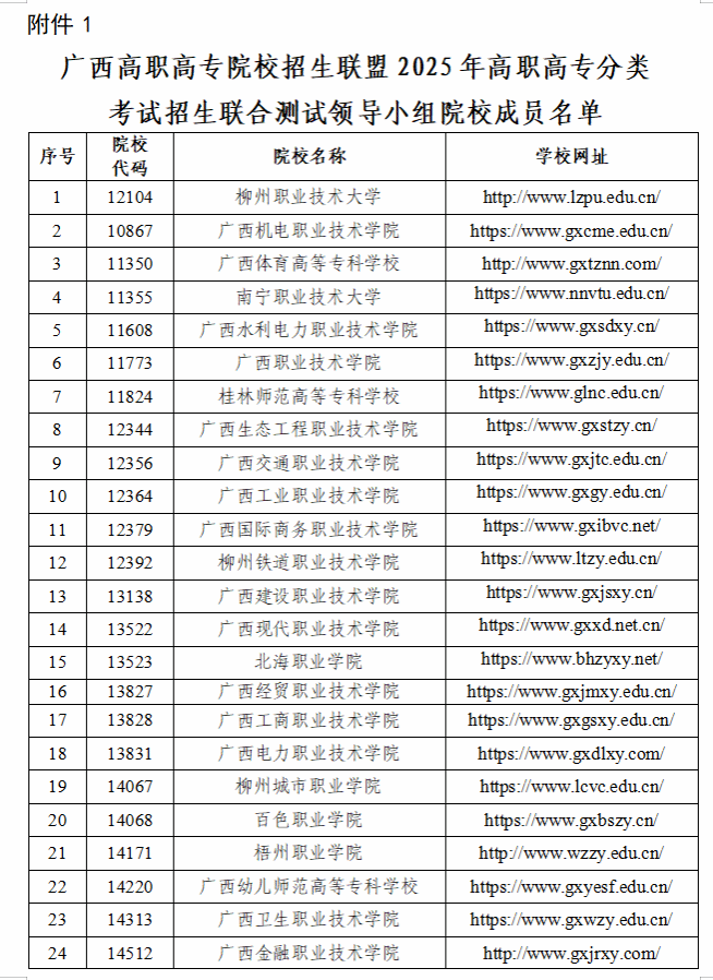 1.广西高职高专院校招生联盟2025年高职高专分类考试招生联合测试领导小组院校成员名单
