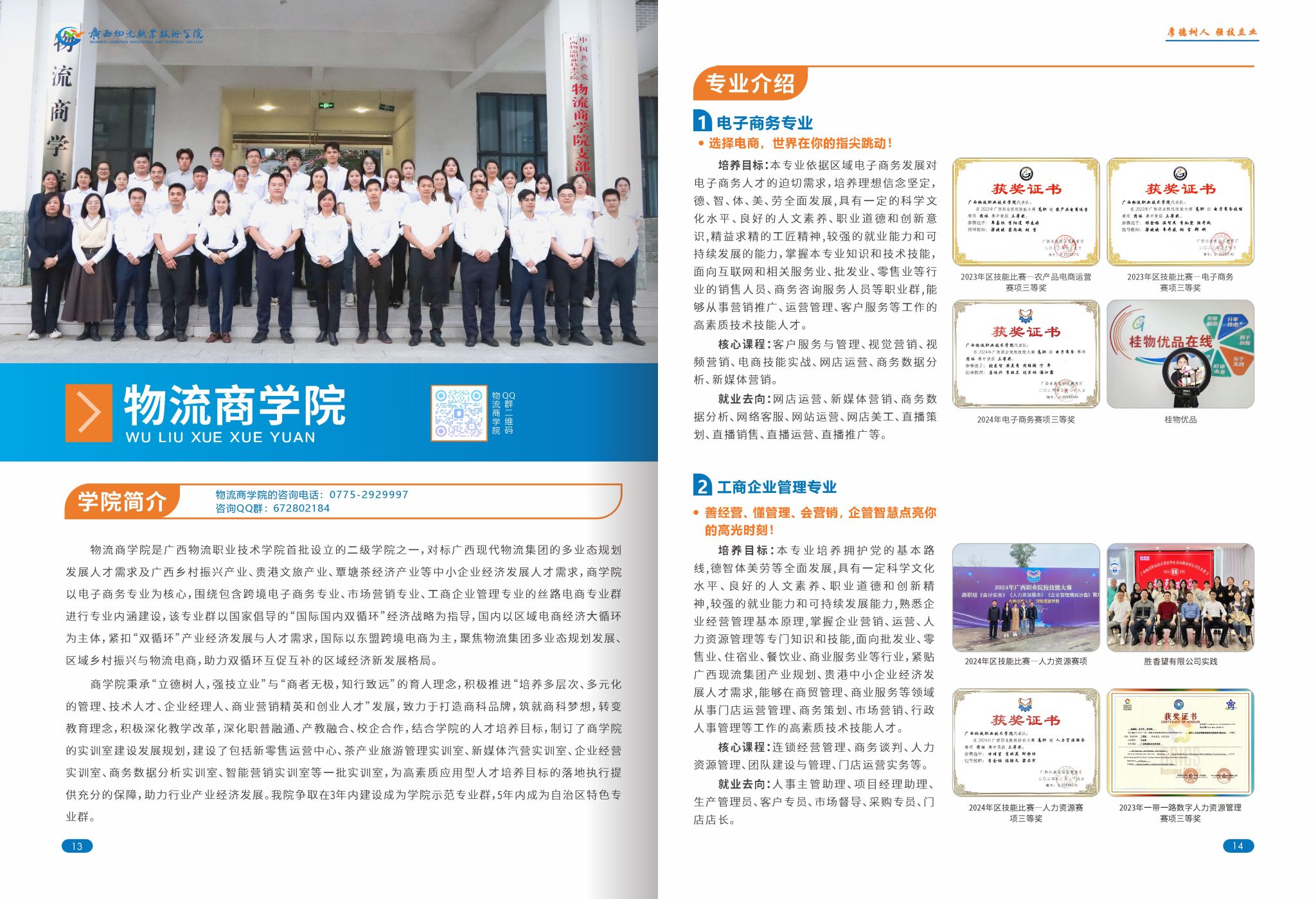 物流商学院对标广西现代物流集团的多业态规划发展人才需求及广西乡村振兴产业、贵港文旅产业、覃塘茶经济产业等中小企业经济发展人才需求,以电子商务专业为核心,围绕包含跨境电子商务专业、市场营销专业、工商企业管理专业的丝路电商专业群进行专业内涵建设。