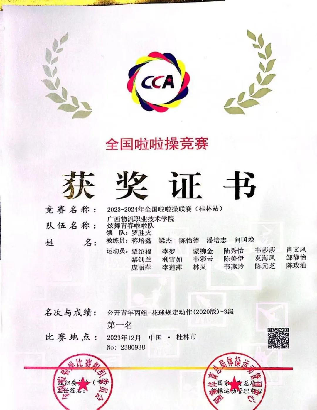 1.全国啦啦操联赛(桂林站)公开青年丙组-花球规定动作(2020版)—3级:冠军;