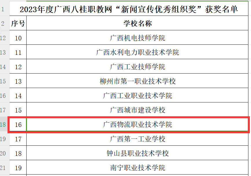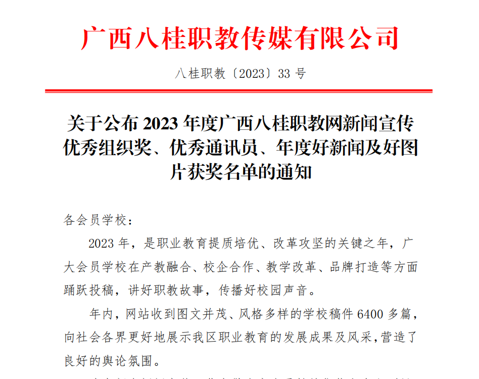近日,广西八桂职教网公布了2023年度新闻宣传优秀组织奖、优秀通讯员、年度好新闻及好图片获奖名单,pp电子获得以下荣誉: