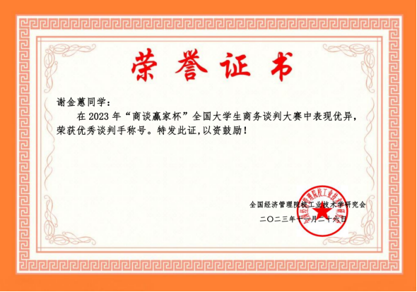近日,2023年“商谈赢家杯”全国大学生商务谈判大赛赛程落下帷幕。本届大赛吸引了全国40余所高校160余支队伍同场竞技。pp电子人文教育学院组织的四支队伍分别荣获大赛(网络赛高职组)一等奖1项、二等奖1项、三等奖2项,其中谢金蕙获得“优秀谈判手”称号。