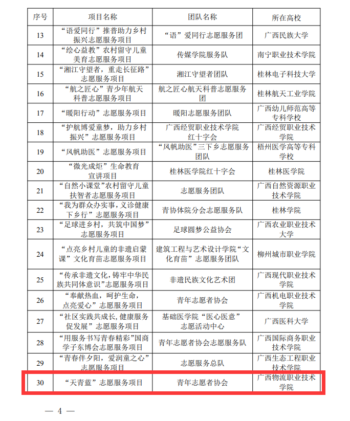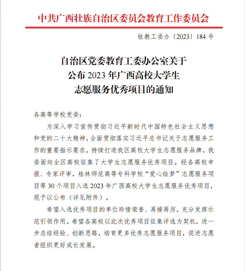 近日,自治区党委教育工委办公室下发了《自治区党委教育工委办公室关于公布2023年广西高校大学生志愿服务优秀项目的通知》,全区高校共30个志愿服务项目入选。pp电子“天青蓝”志愿服务项目成功入选,这是pp电子第一支入选自治区级的志愿服务项目。