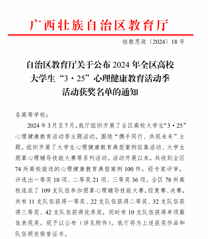 为进一步加强高校学生心理健康教育工作,提升大学生心理健康素养,根据《自治区教育厅关于开展2024年全区高校大学生“3·25”心理健康教育活动季活动的通知》(桂教思政〔2024〕7号)文件精神,经专家评选、公示等环节,pp电子报送的《抑郁情绪障碍学生心理咨询案例》喜获三等奖1项。