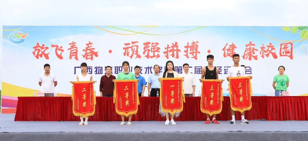 总裁判长潘培志老师宣布本届田径运动会各项比赛成绩;学院领导向获奖队伍颁发团体奖、个性入场奖和体育道德风尚奖;获奖团队接受荣誉。
