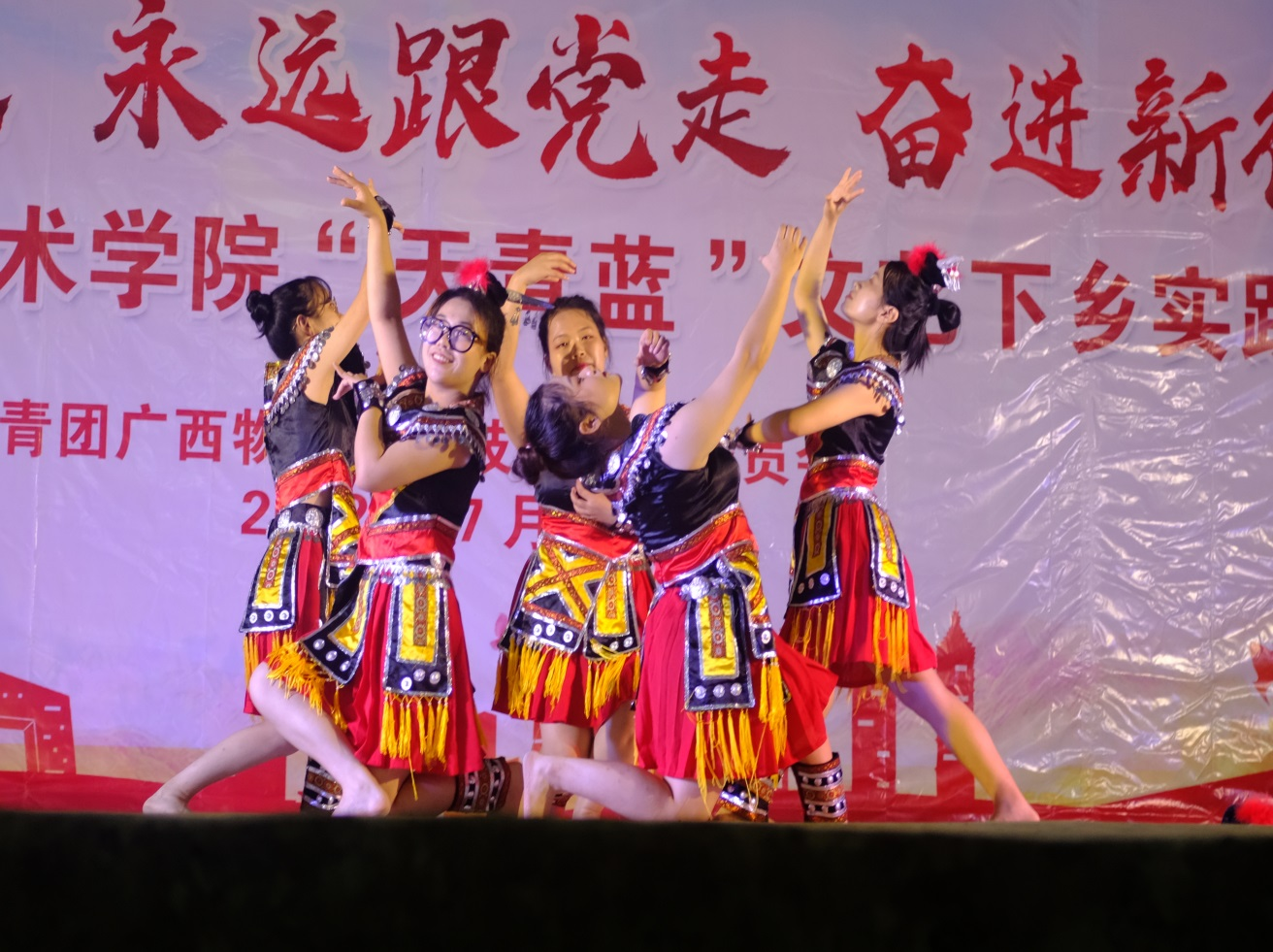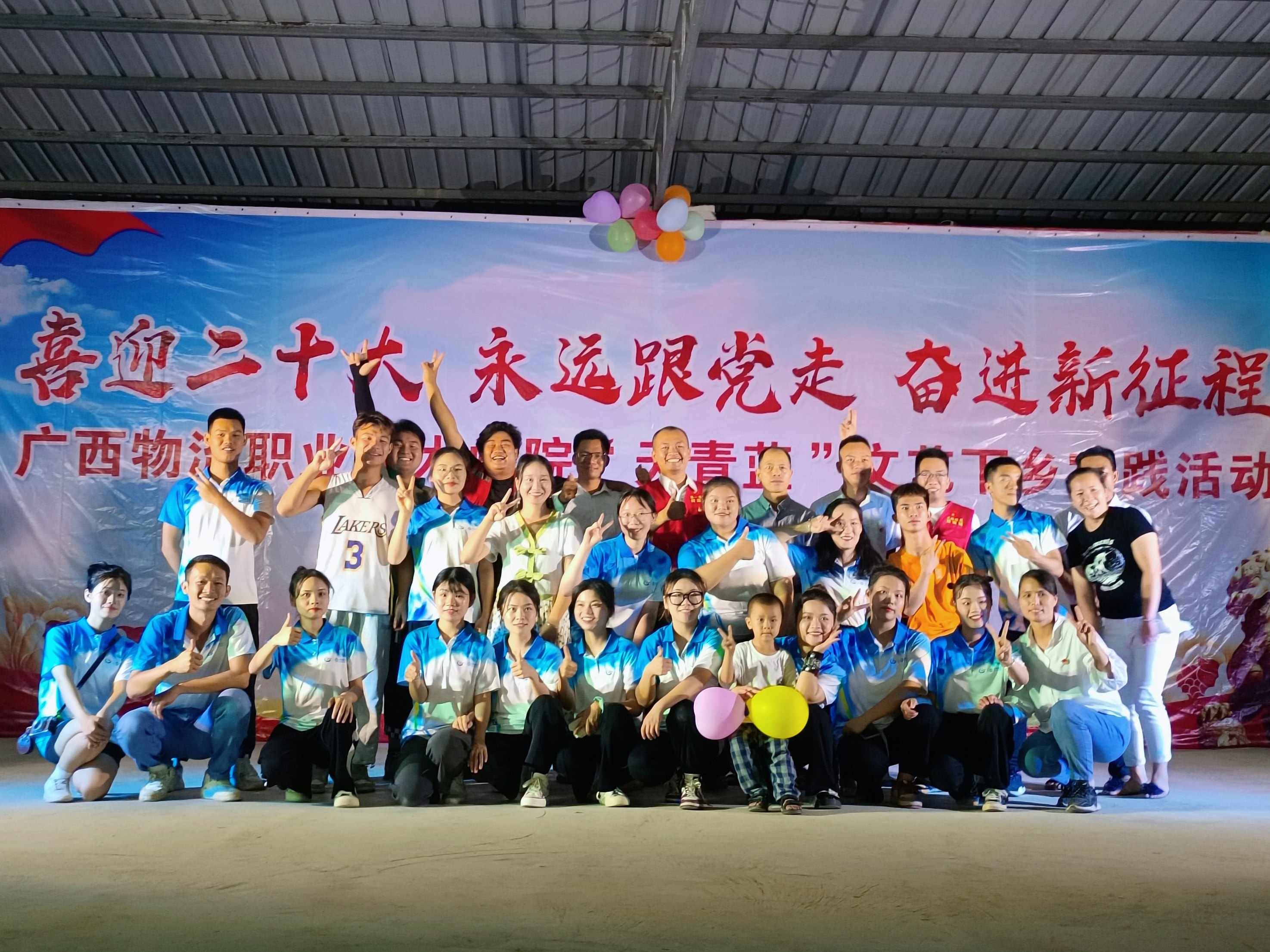 7月25日晚,物流管理学院“物泽八桂”服务团、物流商学院“八桂红商”实践团联合广西现代物流集团驻村工作队在多浪村文化广场举办“喜迎二十大 永远跟党走 奋进新征程”——pp电子官方网站“天青蓝”文艺下乡实践汇演,为基层群众送上了一场简单而别致的文化演出。实践团立足文化惠民,传承红色基因、弘扬革命精神,通过送文艺演出到基层,丰富基层群众精神文化生活,提振广大群众乡村振兴精气神,坚定现场观众对中国共产党的情感,对实现国家富强、民族振兴、人民幸福的信心和决心,激情唱响奋斗新时代的昂扬旋律。
