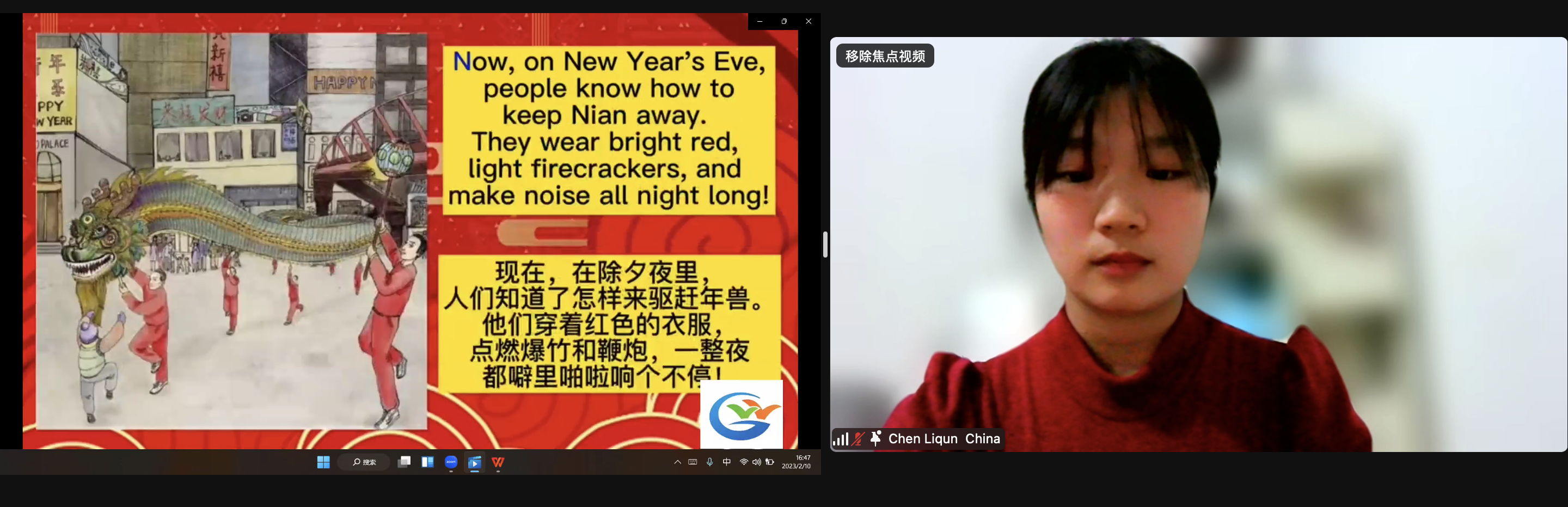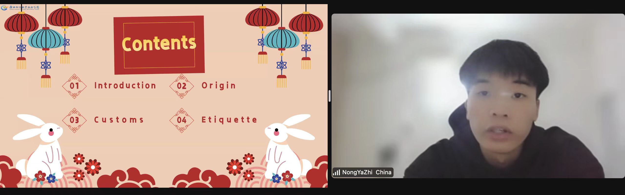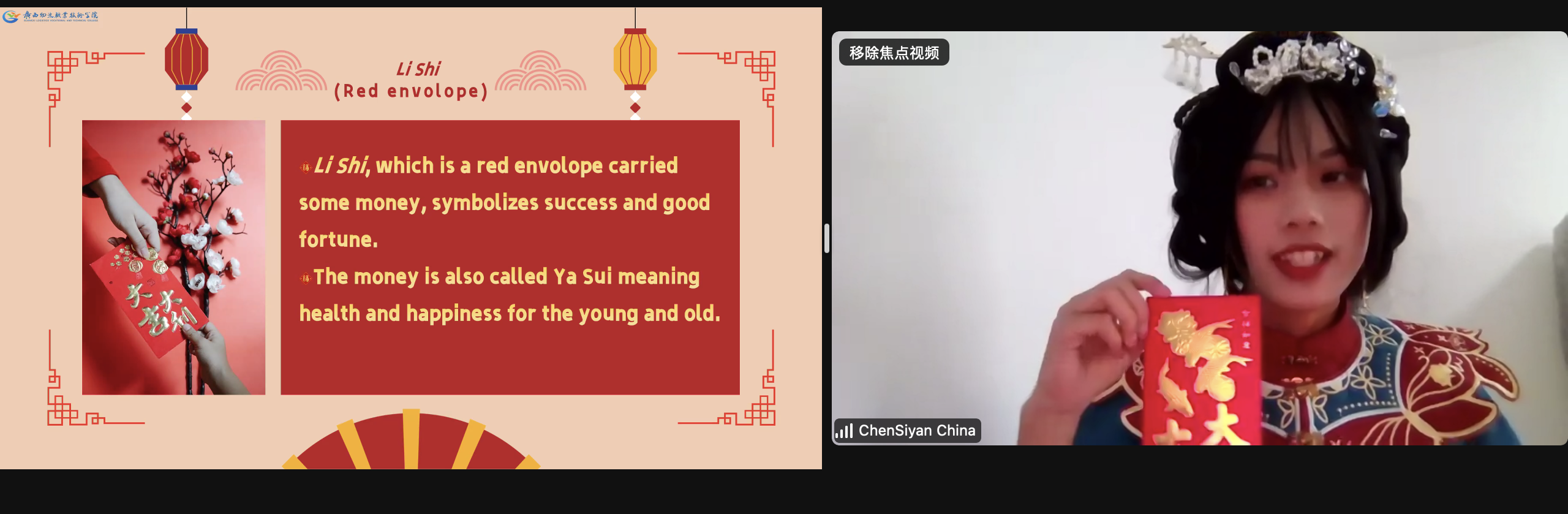在活动中,pp电子农雅智、陈利群、陈思燕、吴科四位同学在人文学院黄鸿琴老师及国际教育学院刘彩芳老师的指导下,用英文向俄罗斯、东南亚等联盟院校以及区内兄弟院校的师生介绍了我们中国春节的起源、习俗以及拜年礼仪等。