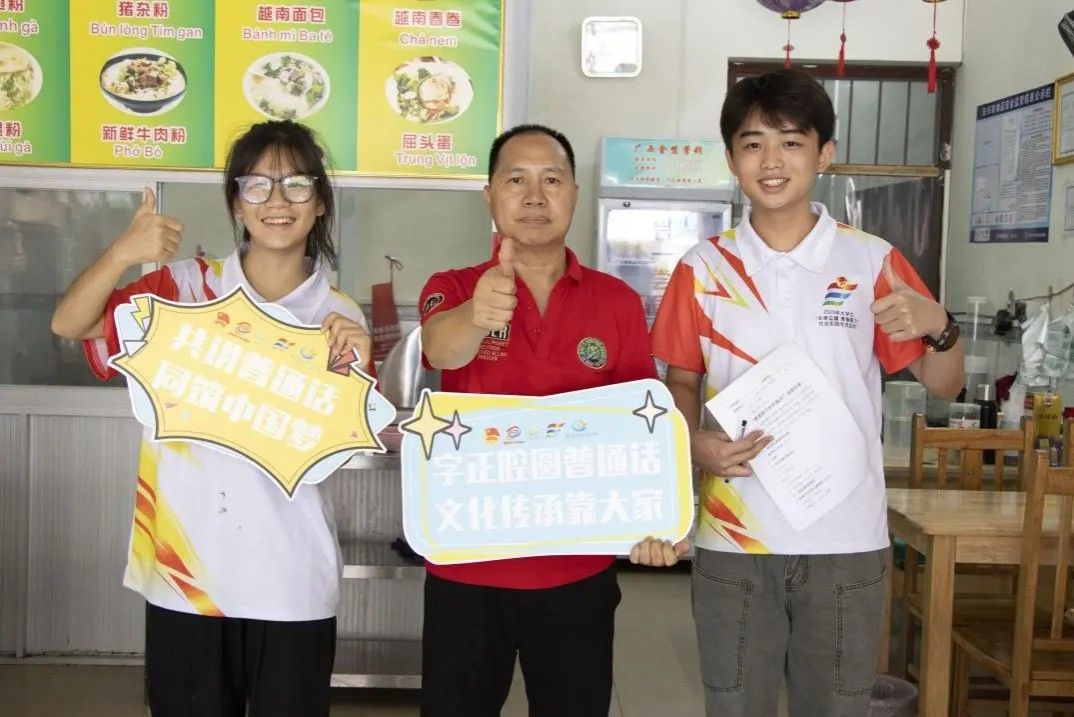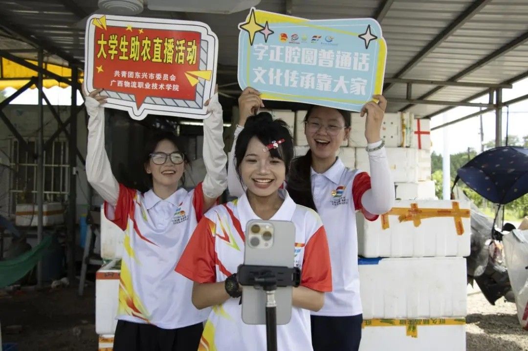 在东兴市江平镇黄竹村的“青耘中国·夏耕梦想”公益直播助农现场,服务团队员将普通话推广小游戏巧妙融入直播互动环节。直播间里热火朝天,网友们不仅为农产品下单,还饶有兴趣地参与普通话学习。