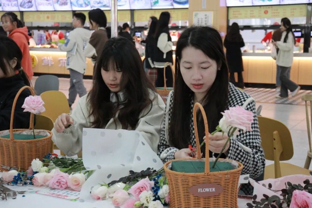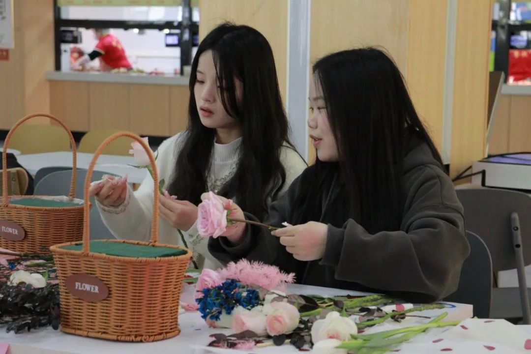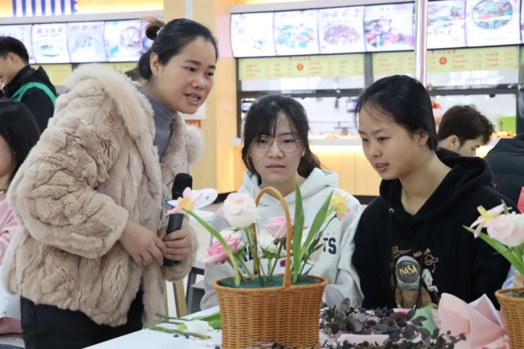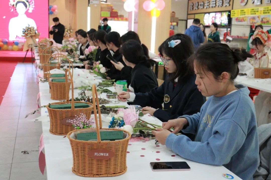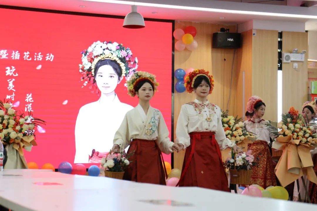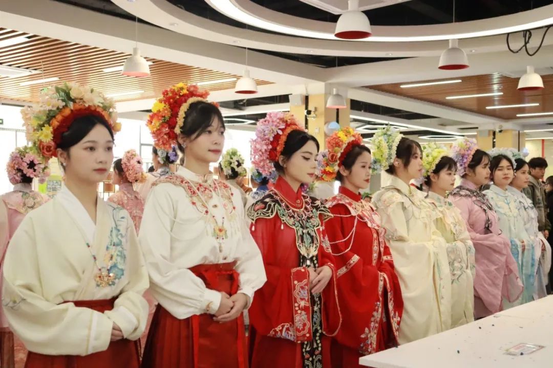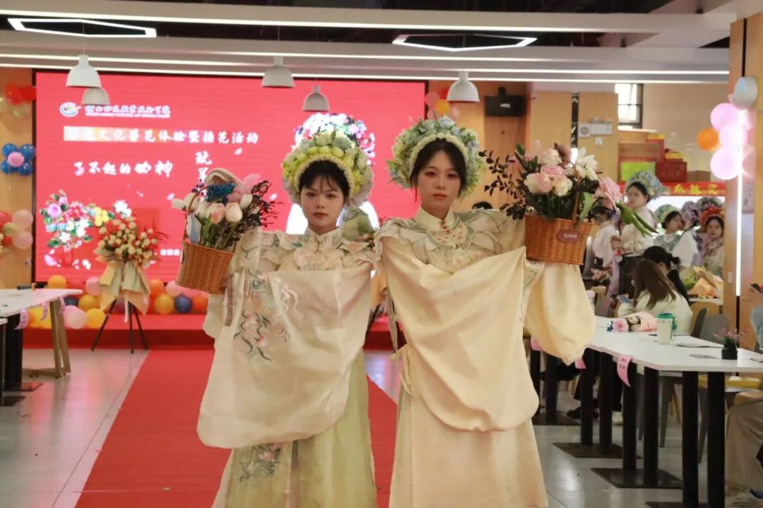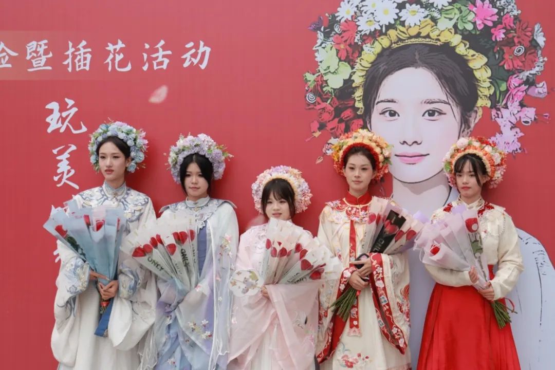 特色非遗簪花活动更是深受学生喜爱,邀请了簪花手艺人分享簪花习俗,并现场为参加活动的师生簪花,做好装造的师生红妆马面,手持花篮,带来一场精彩的汉服盛宴。
