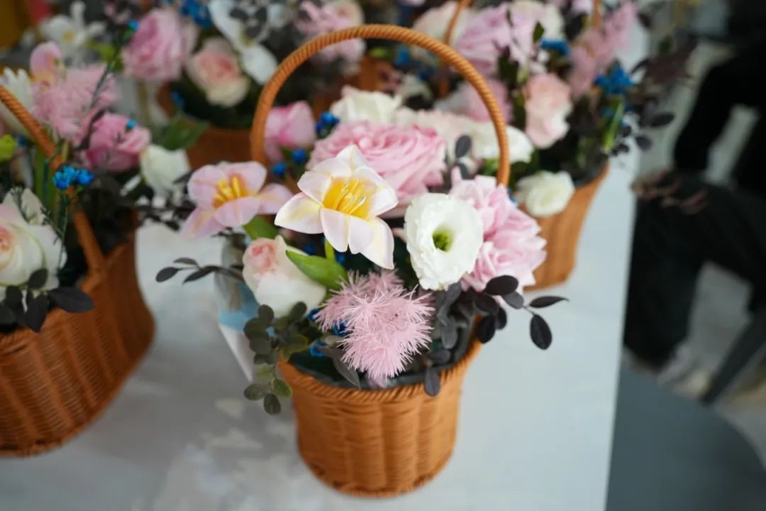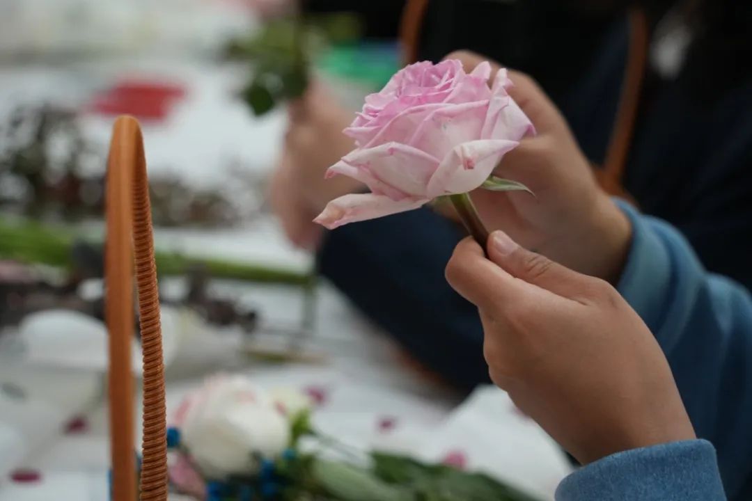 插花活动现场气氛温馨,花艺师介绍了选花、颜色搭配、造型等艺术插花技巧,根据不同的花材、颜色进行现场演示。大家认真对各类鲜花进行搭配裁剪,有点有面,相互映衬,一幅幅生机盎然的插花作品呈现眼前。