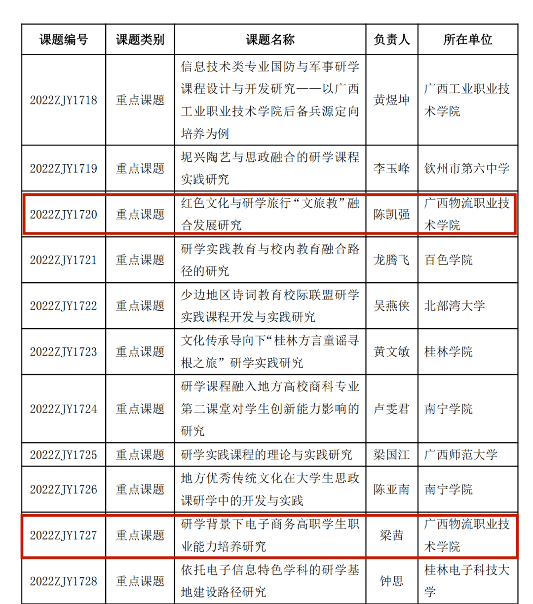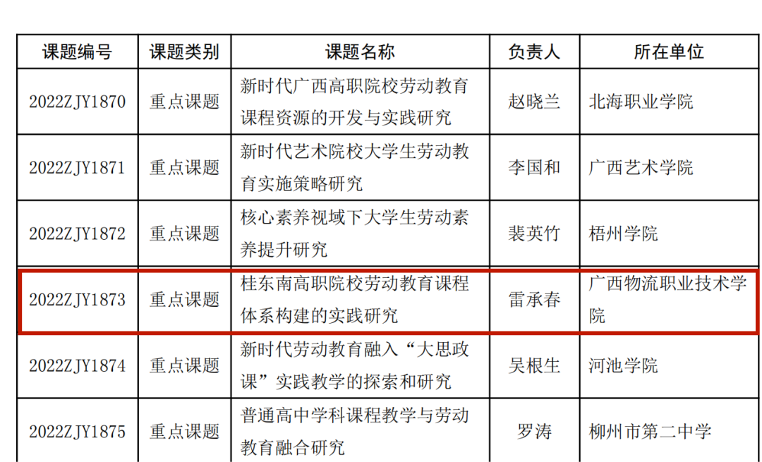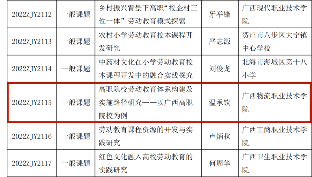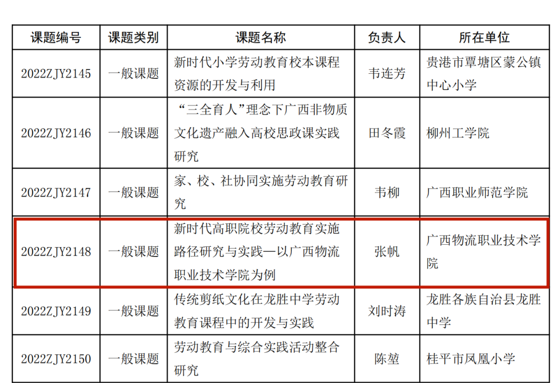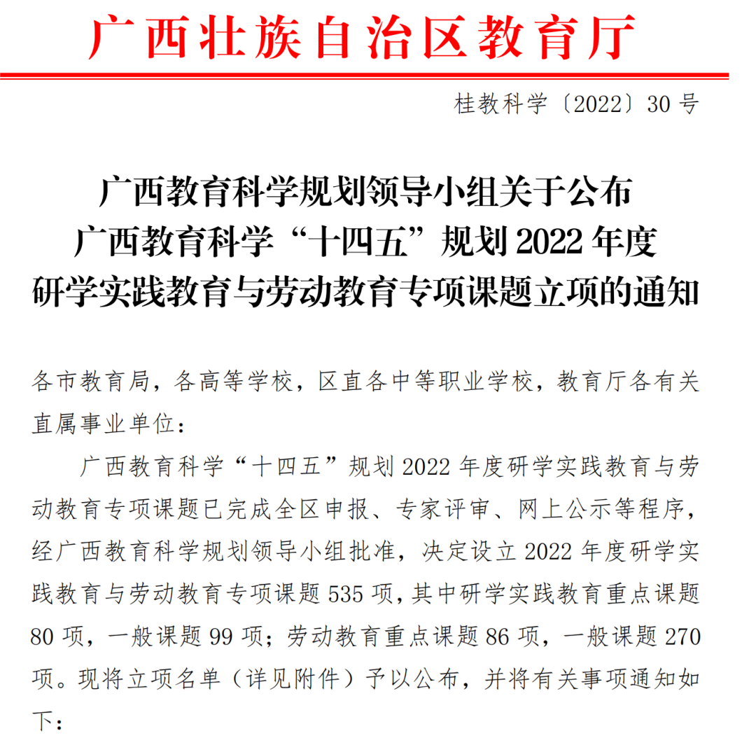 根据《广西教育科学规划领导小组关于公布广西教育科学“十四五”规划2022年度研学实践教育与劳动教育专项课题立项的通知》(桂教科学〔2022〕30号),设立2022年度研学实践教育与劳动教育专项课题535项,其中研学实践教育重点课题80项、一般课题99项,劳动教育重点课题86项,一般课题270项。pp电子申报的5项课题均喜获立项,其中陈凯强、梁茜两位老师主持的课题喜获研学实践教育重点课题立项,雷承春老师主持的课题喜获劳动教育重点课题立项,温承钦、张帆两位老师主持的课题喜获劳动教育一般课题立项。