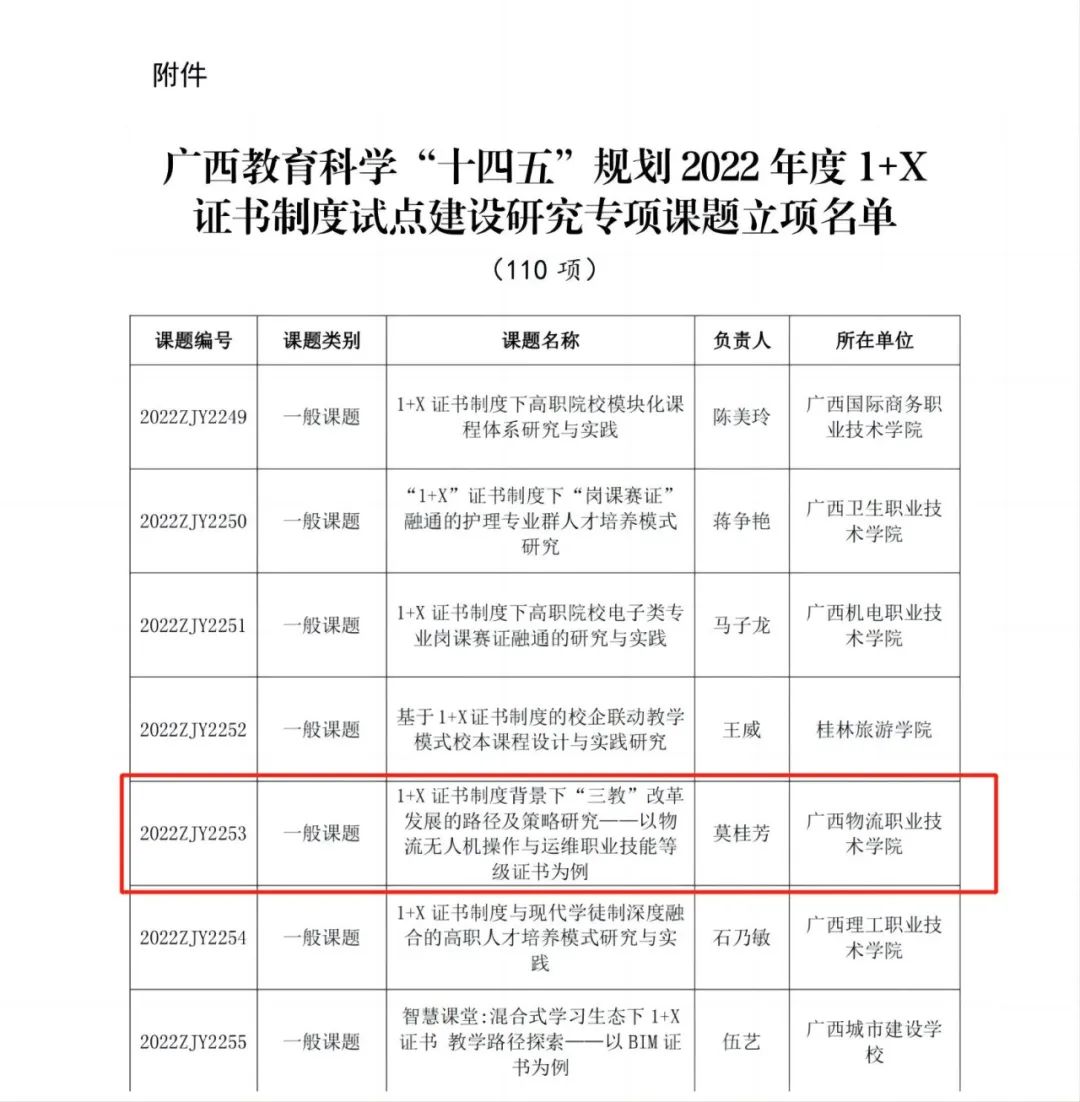 根据《广西教育科学规划领导小组关于公布广西教育科学“十四五”规划2022年度1+X证书制度试点建设研究专项课题立项的通知》(桂教科学〔2022〕33号),设立2022年度1+X证书制度试点建设研究专项课题110项,其中重点课题56项,一般课题54项。pp电子莫桂芳老师申报的《1+X证书制度背景下“三教”改革发展的路径及策略研究——以物流无人机操作与运维职业技能等级证书为例 》课题喜获立项。
