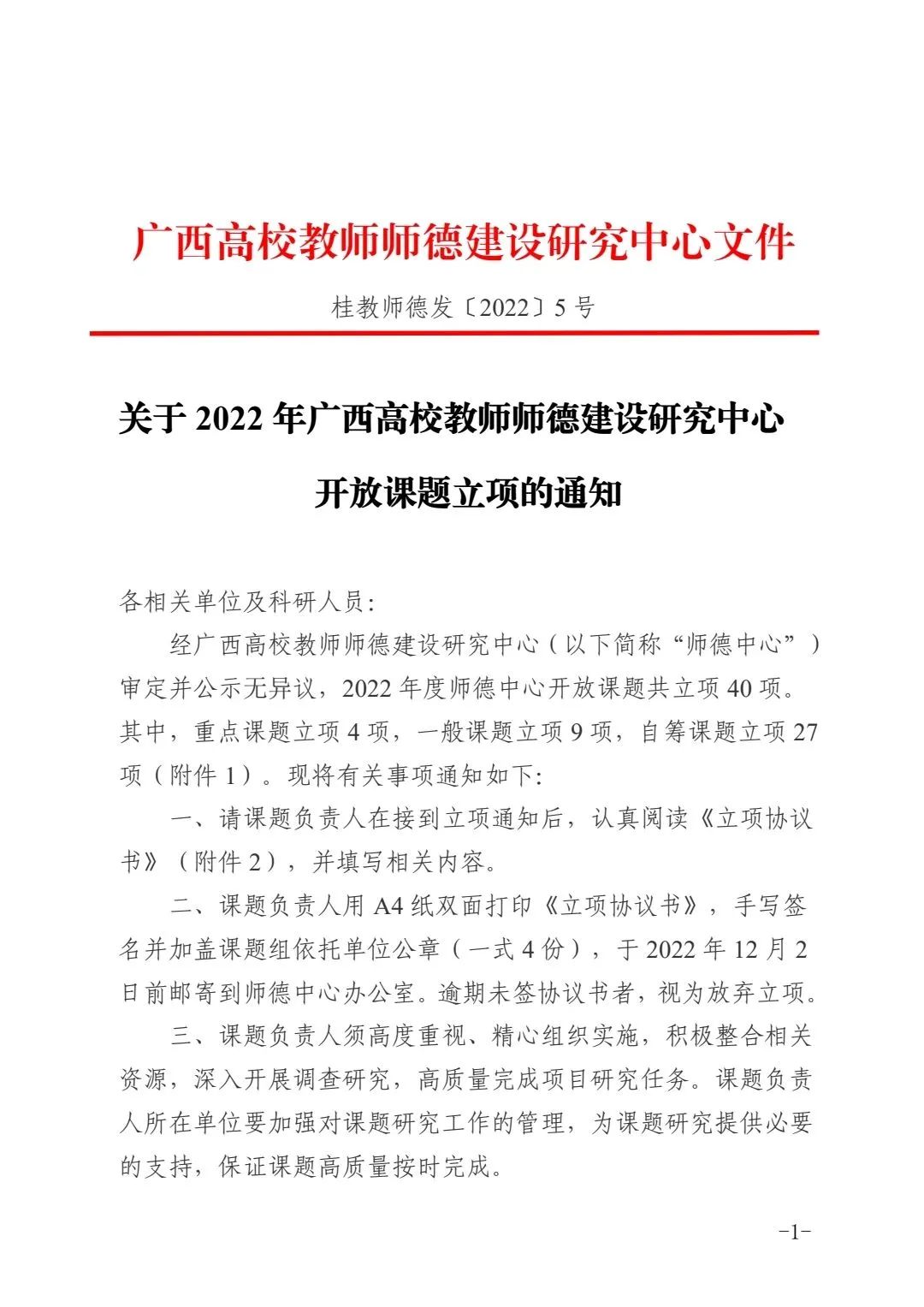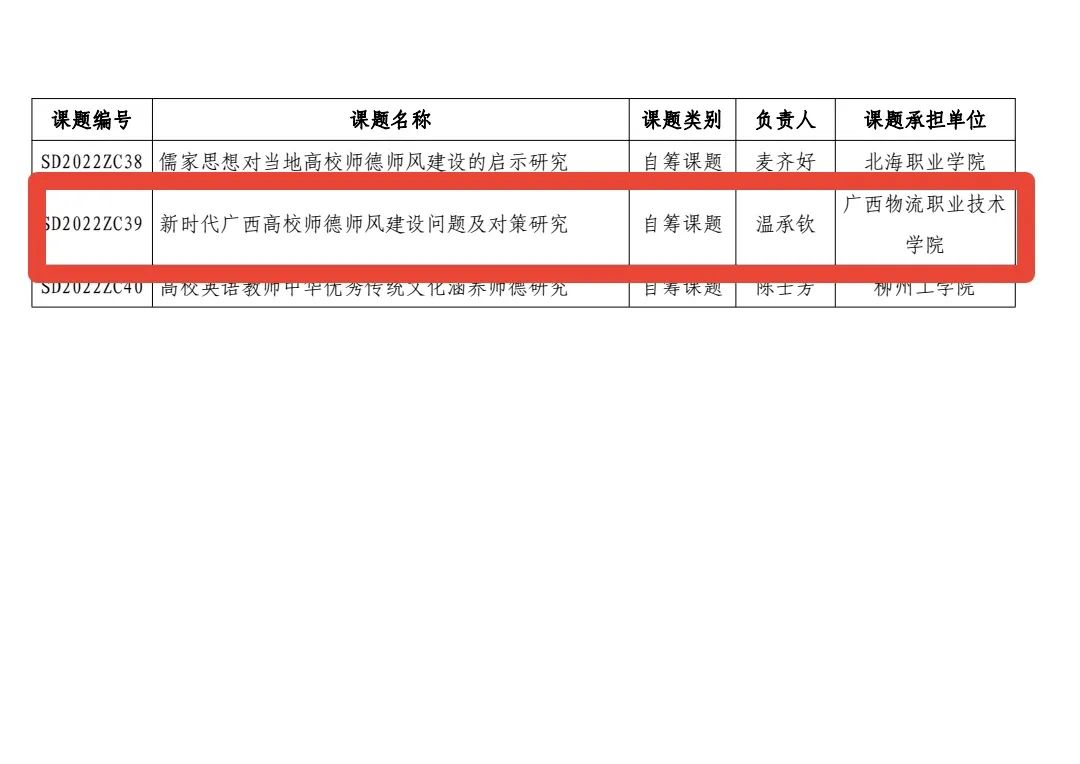 根据《广西高校教师师德建设研究中心关于2022年广西高校教师师德建设研究中心开放课题立项的通知》(桂教师德发〔2022〕5号),2022年度师德中心开放课题共立项40项,其中重点课题4项,一般课题9项,自筹课题立项27项。pp电子物流交通学院