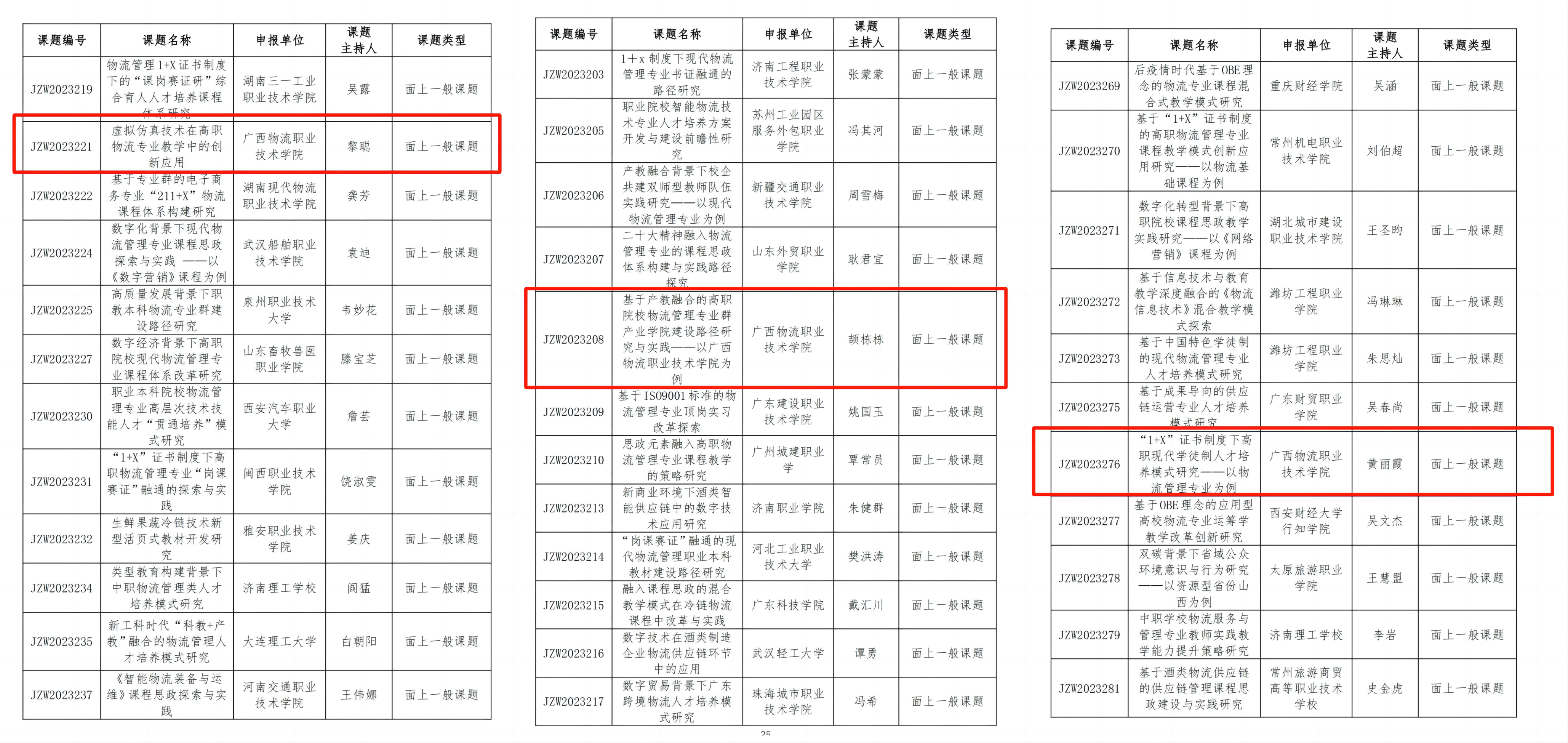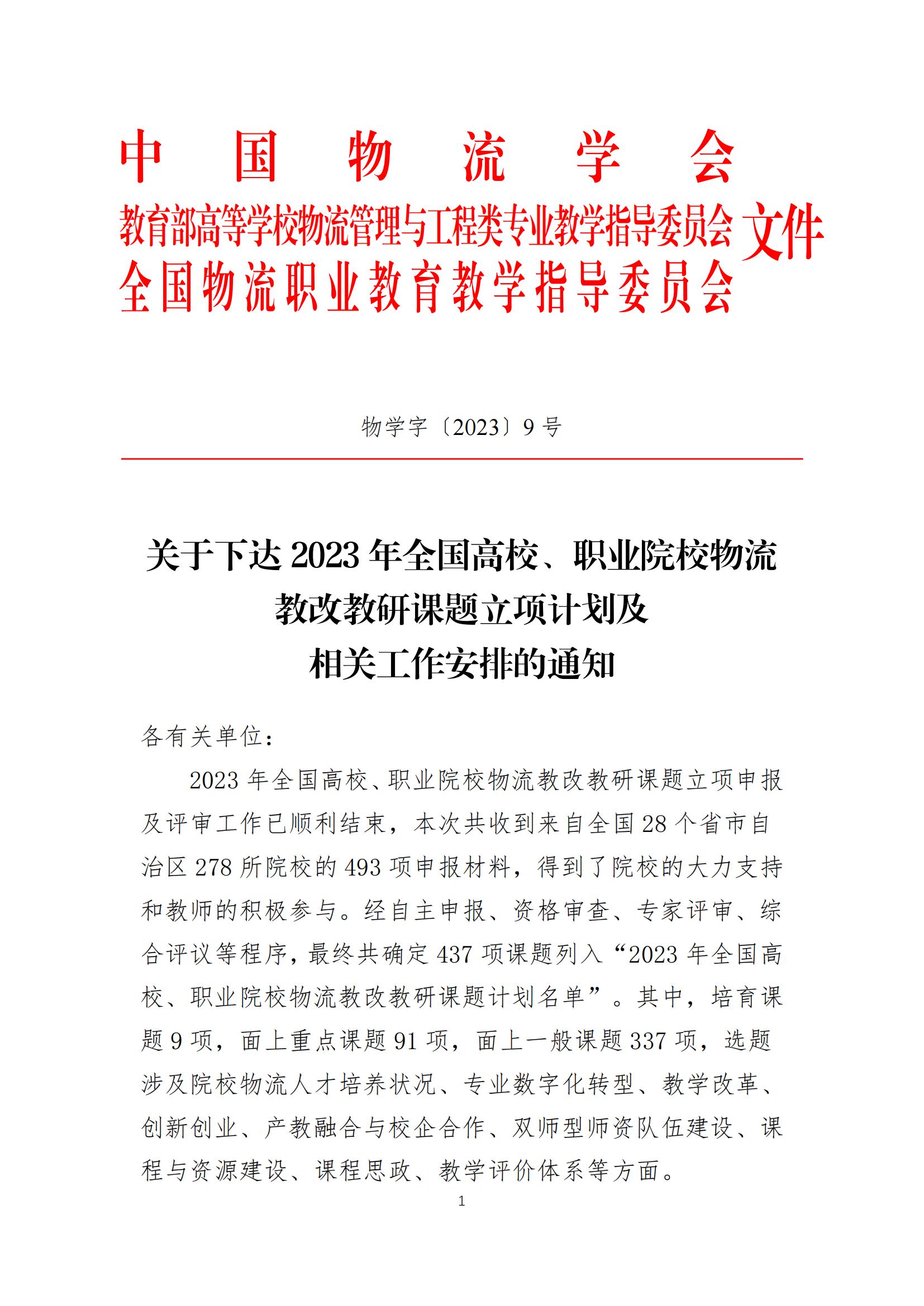 根据《关于下达2023年全国高校、职业院校物流教改教研课题立项计划及相关工作安排的通知》,确定437项课题列入“2023年全国高校、职业院校物流教改教研课题计划名单”。其中,培育课题9项,面上重点课题91项,面上一般课题337项。pp电子黎聪、黄丽霞、颉栋栋三位老师主持申报的课题喜获立项!