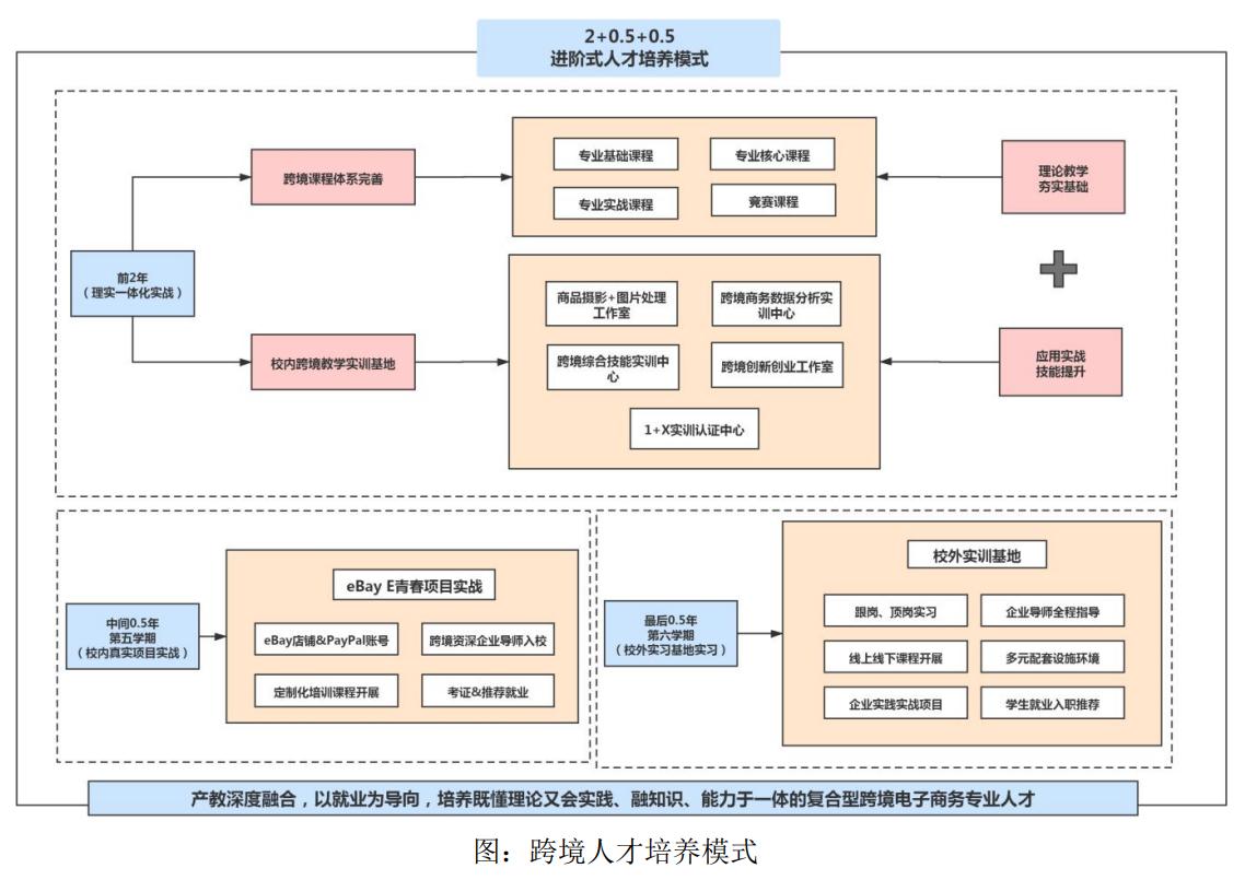 本专业结合区域经济发展需求,通过跨境电商核心与特色课程的学习和实践,培训学生成为懂外语、懂国际贸易、懂电子商务的“三线合一”复合型跨境电商人才。强调培养学生实践能力,做到理论扎实、技能出众,以证促学,以赛促学促教,以跨境电商B2B/B2C数据运营技能证、港口理货技能证、网店运营推广技能证书等,实现毕业证与职业技能等级证双向通行的高技能人才培养目标,使学生“毕业即能上岗、上岗即能操作”。