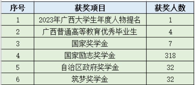 1名学生获得2023年广西大学生年度人物提名,4名学生获得2023年广西区优秀毕业生,7名学生获得国家奖学金,318名学生获得国家励志奖学金,32名学生获得自治区人民政府奖学金,32名学生获得筑梦奖学金。