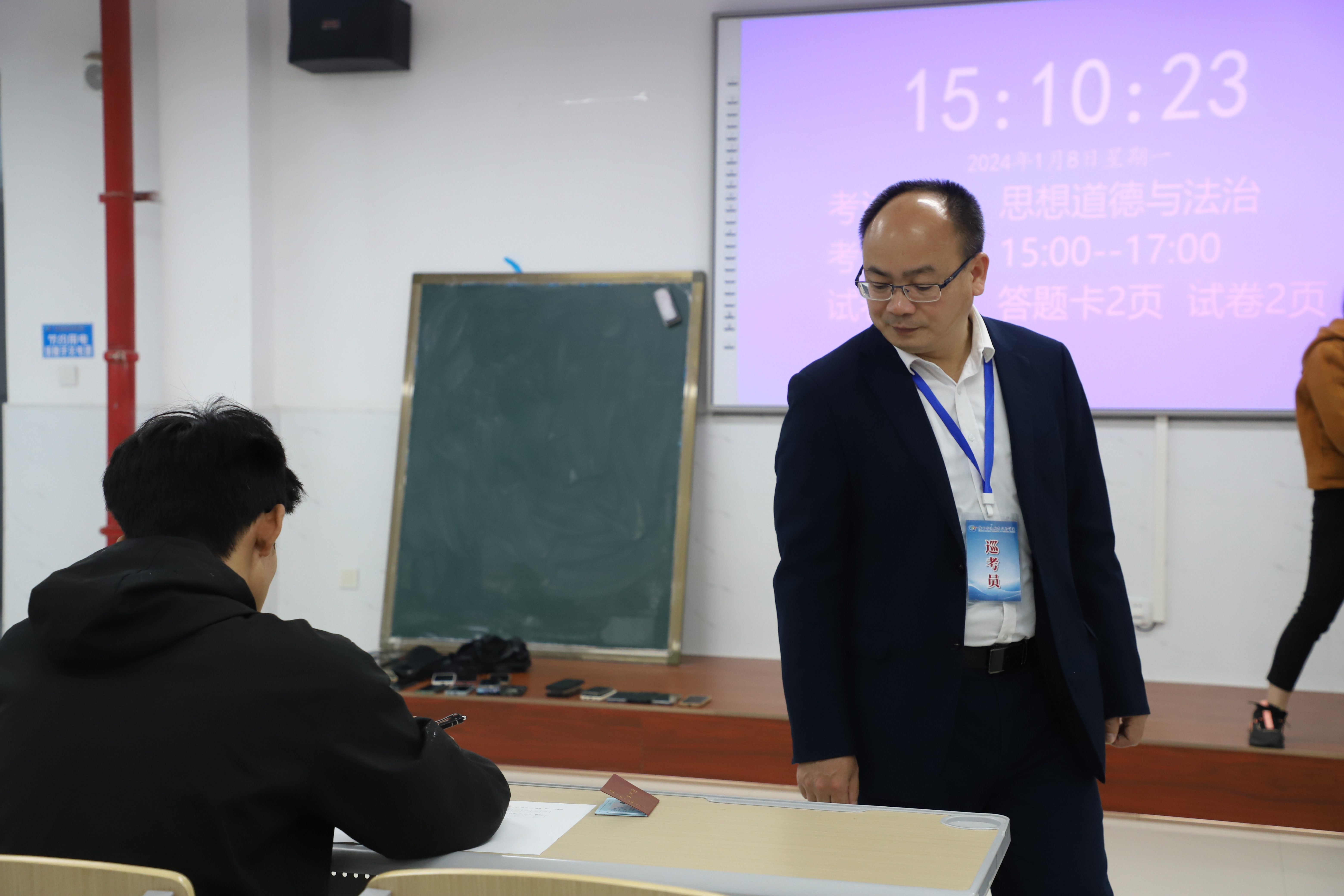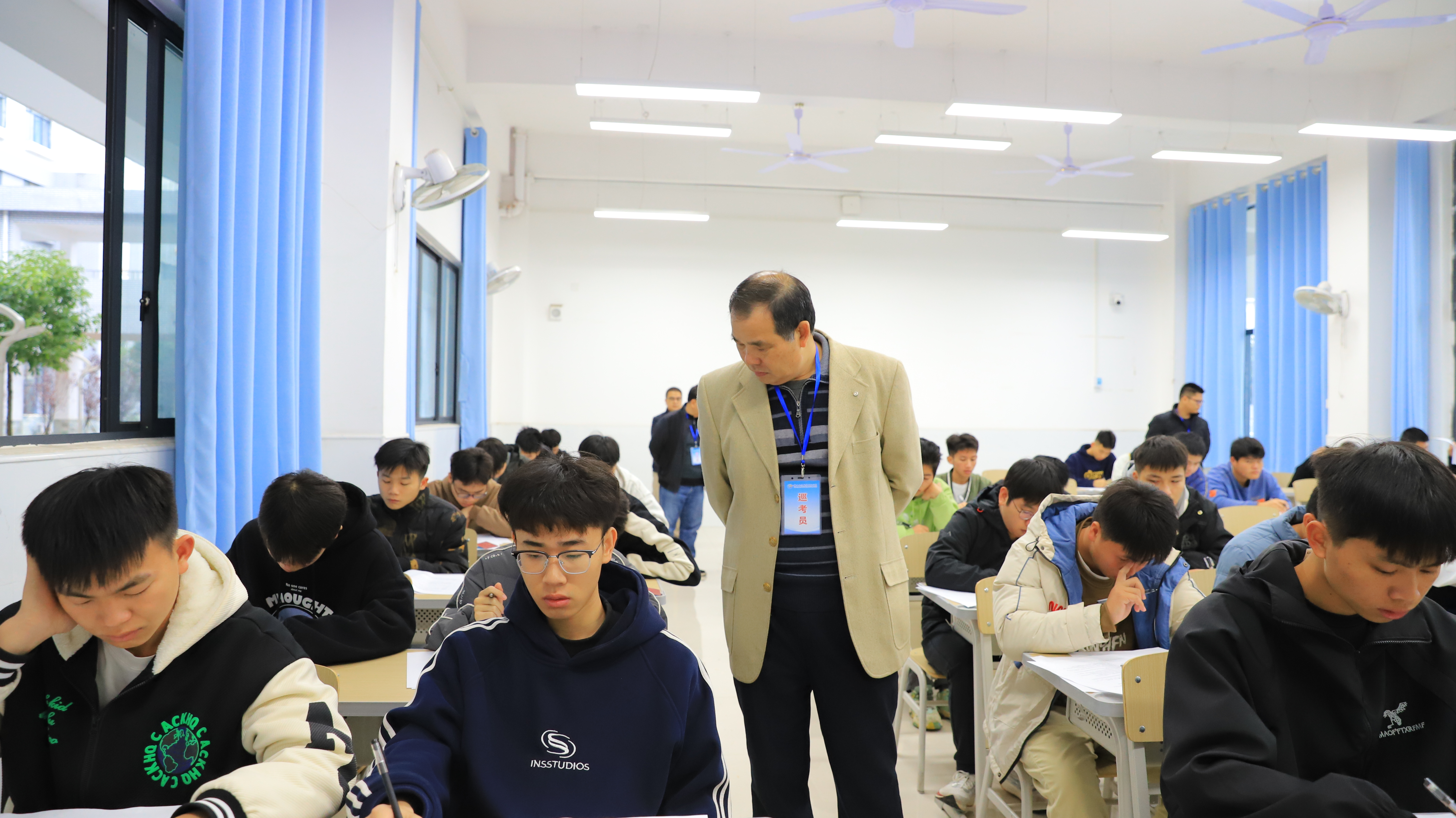 为确保期末考试顺利进行,切实加强考场管理,促进优良教风和学风建设, 2024年1月8日—1月10日,学院党委书记韦光茂,学院党委副书记、院长朱海强带领领导班子成员杨一笔、覃丽燕、陈继文、陈赋光、梁杰深入考场对期末考试组织情况进行了全面、细致的检查和指导。