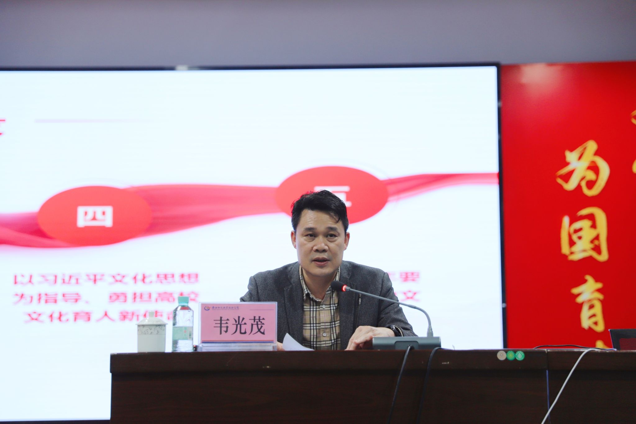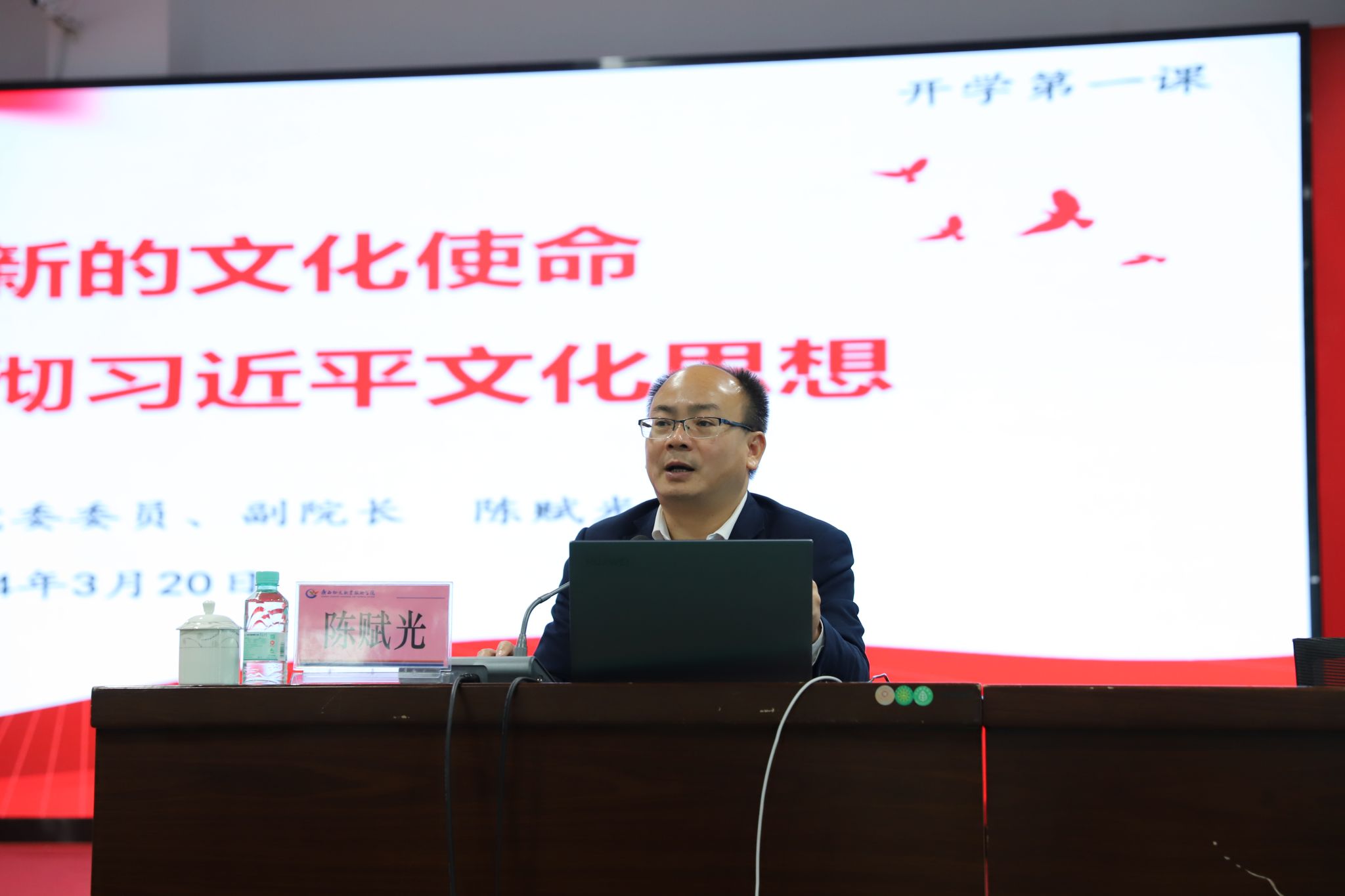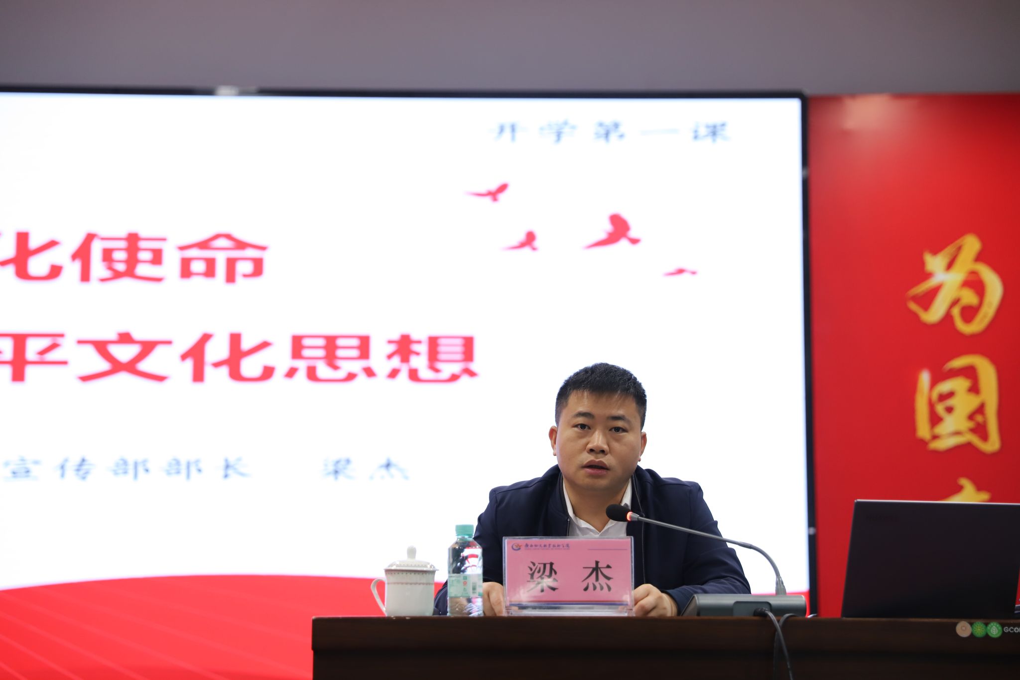 为深入学习贯彻习近平文化思想,全方位增强中华文明在校园的传播力影响力,增强文化自信。2024年3月19-28日,在党委书记韦光茂、院长朱海强的带领下,领导班子成员杨一笔、覃丽燕、陈继文、陈赋光、梁杰分别为联系的二级学院学生讲授“开学第一课”,通过“物院大讲堂”的形式为学生带来了一堂堂富有思想性、理论性、亲和力的思想政治理论课。