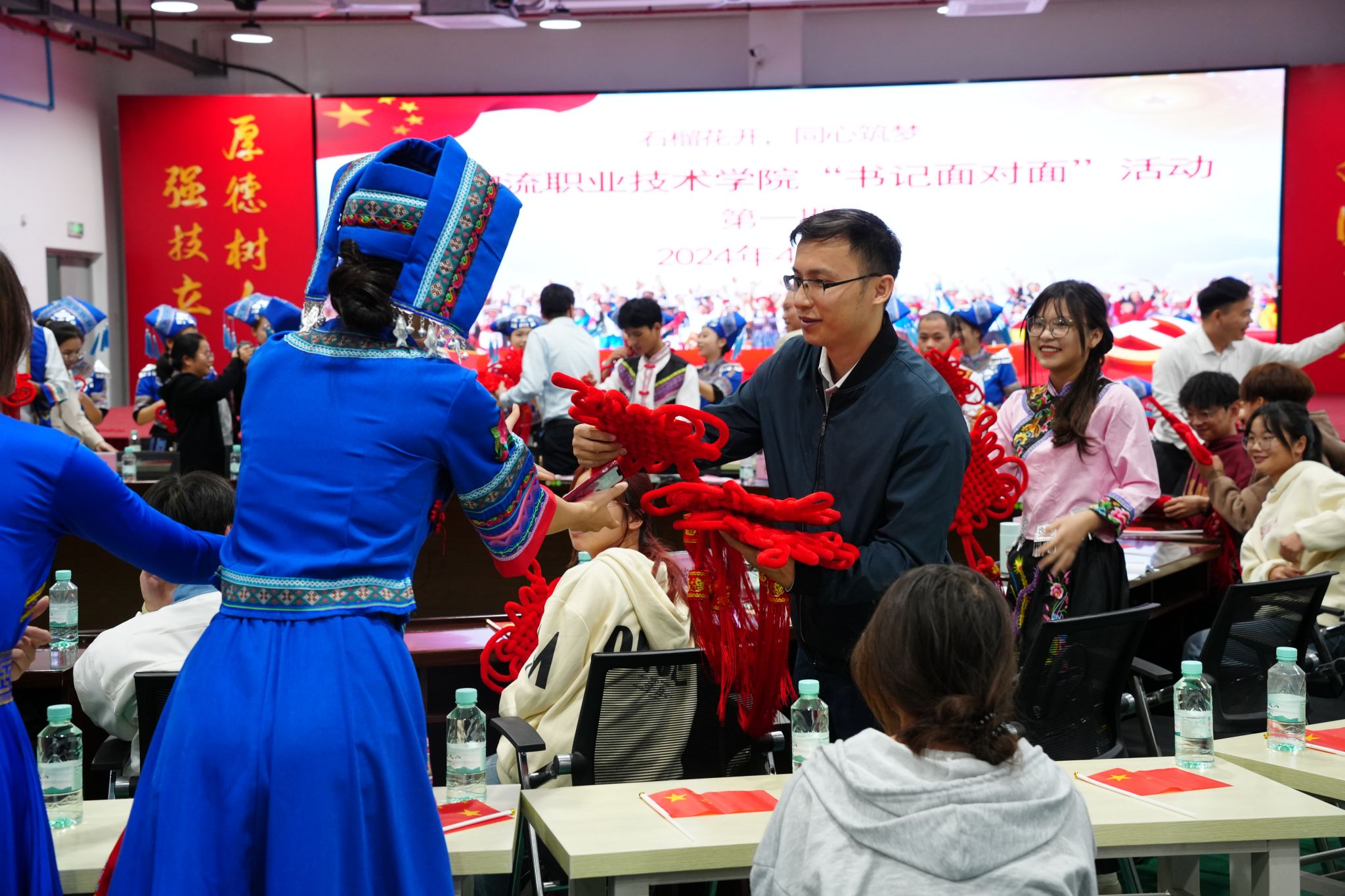 2024年4月7日上午,pp电子在二号实训楼2楼召开“石榴花开,同心筑梦”第一期“书记面对面”主题圆桌座谈会,学院党委书记韦光茂与各民族学生代表齐聚一堂,面对面开展交流并为学生讲授专题思政课。学院党委副书记、工会主席杨一笔主持座谈会。