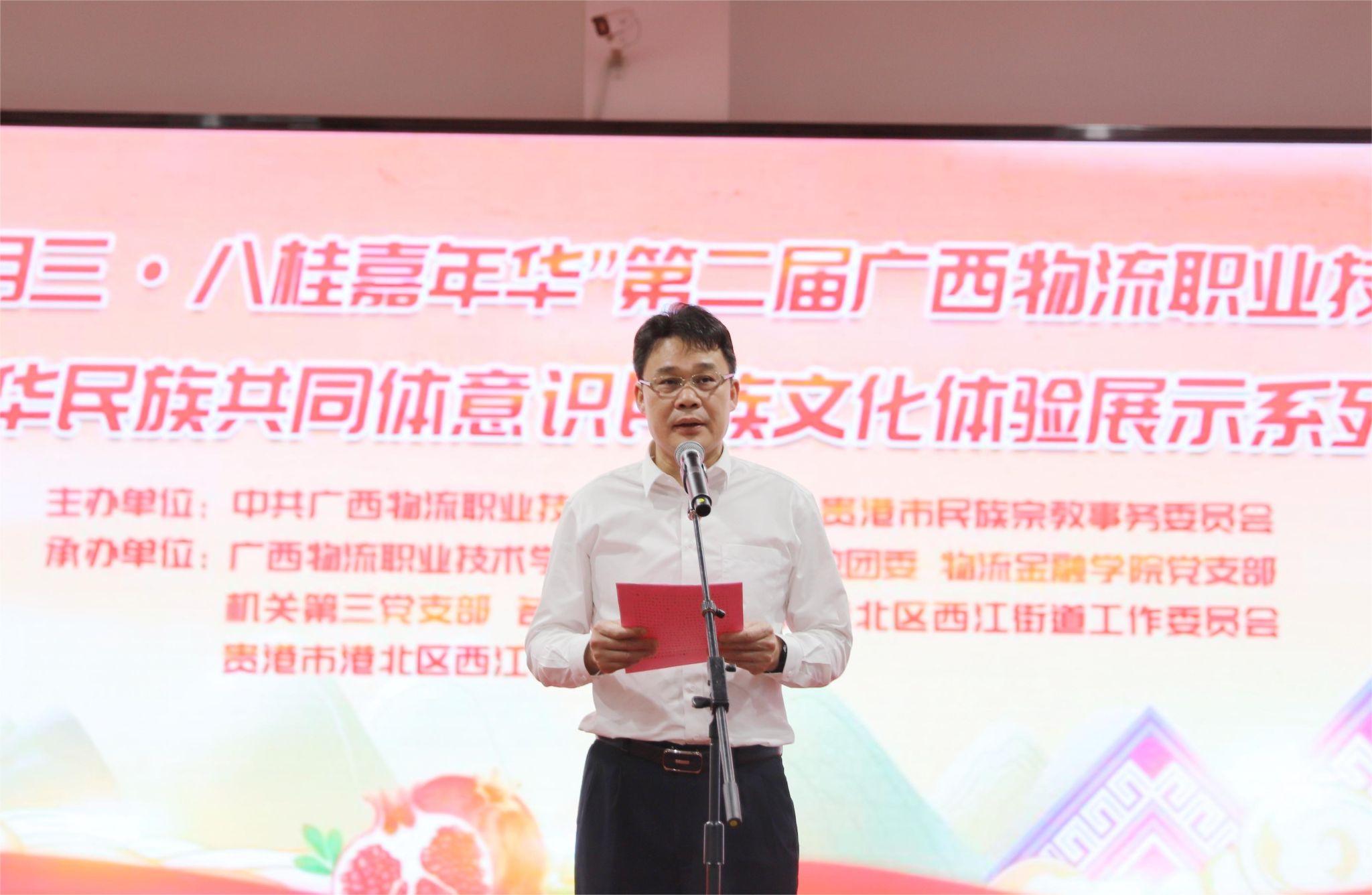 韦光茂在致辞中表示,自学院办学以来,各族师生守望相助、团结拼搏,形成了多民族师生交往交流交融的局面。要聚焦铸牢中华民族共同体意识这条主线,以创建民族团结示范校为牵引,打造民族团结进步的“物院样板”,牢固树立休戚与共、荣辱与共、生死与共、命运与共的共同体理念,传承弘扬中华优秀文化,构筑中华民族共有精神家园,做一朵维护民族团结的“石榴花”,奋力共建壮美广西。韦光茂宣布活动开幕!