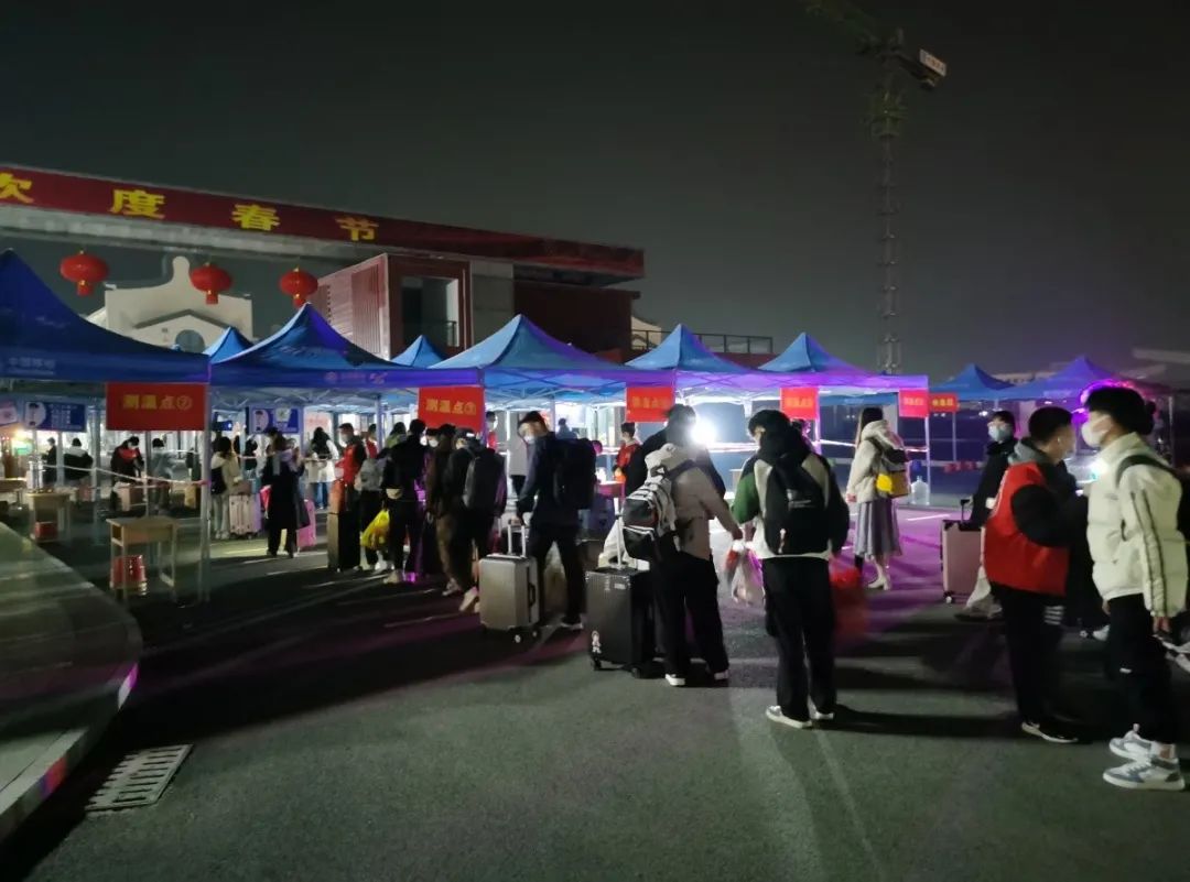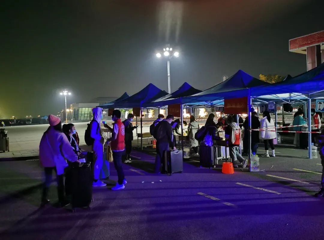 同学们都拎着大包小包的行李,志愿者伸出援手,帮助他们减轻负担。虽然不少同学在寒冷的夜里返校,但入校口志愿者与安保人员的坚守,像是一盏明灯,驱散了黑夜,带来了温暖。