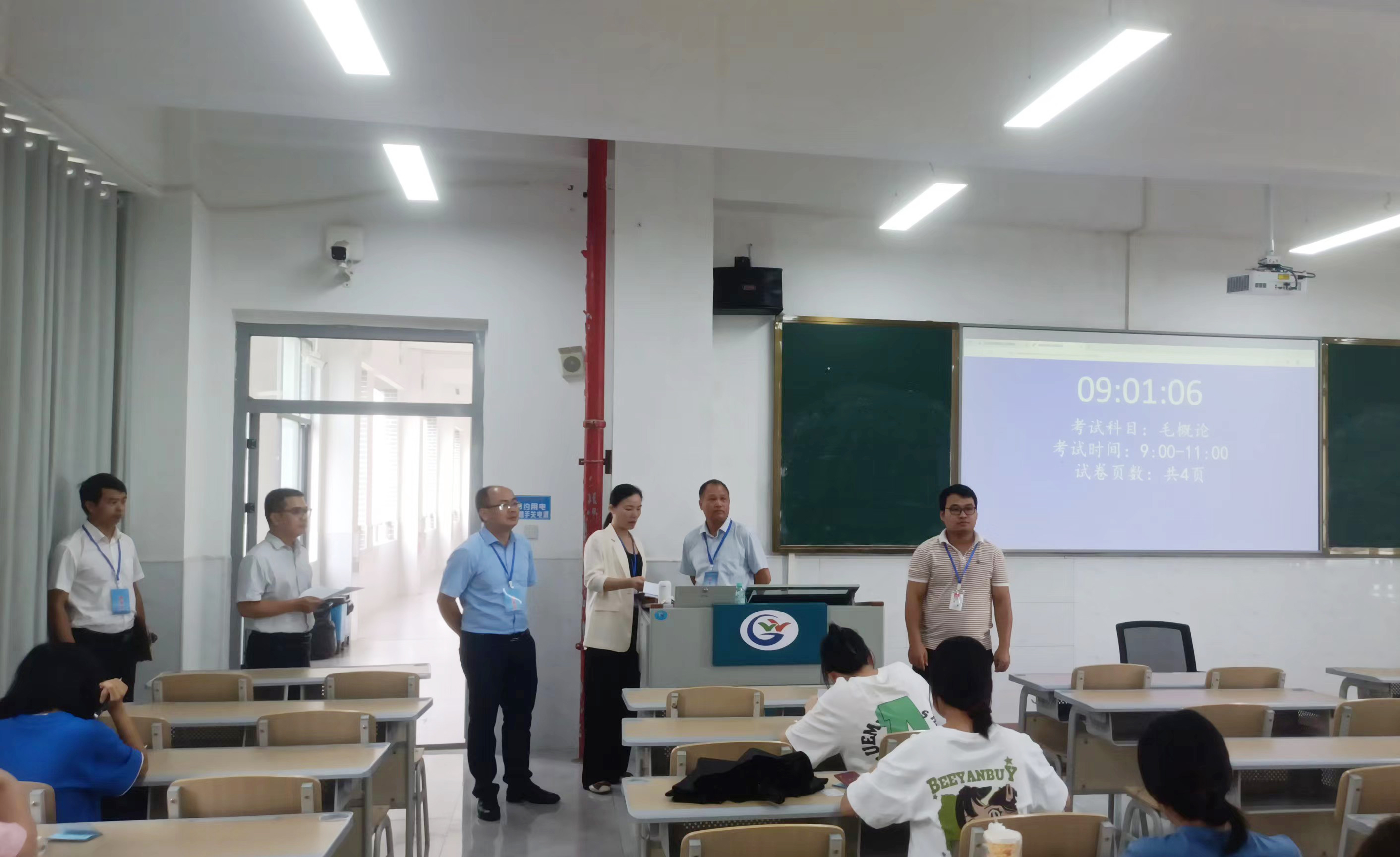 为确保期末考试顺利进行,提高考试管理的科学性和规范性,2023年7月3日,学校党委书记韦光茂带队,党委副书记杨一笔、纪委书记覃丽燕、副院长陈赋光深入考场巡查2022-2023学年下学期期末学生考试情况。教务处、马克思主义学院负责人陪同。