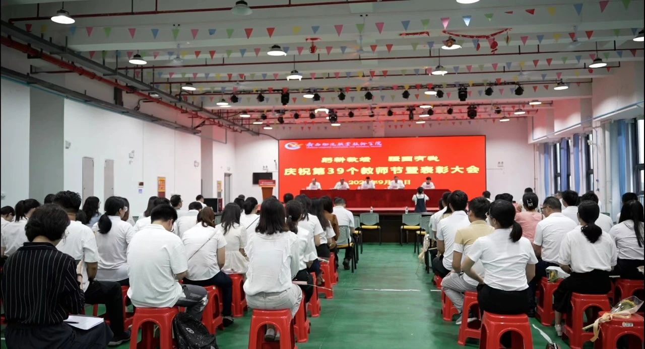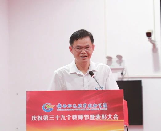 2023年9月10日,学院在二号实训楼召开庆祝第39个教师节暨表彰大会,激励全校教师积极投身教育强国建设实践,充分展现新时代新征程高质量教师队伍建设的突出成就和广大教师立德树人、自信自强的精神风貌。学院党委书记韦光茂出席大会并讲话。党委副书记、院长朱海强主持大会并传达学习习近平总书记致信全国优秀教师代表座谈会教师代表精神。学院领导班子成员杨一笔、覃丽燕、陈赋光及全体教职工参加大会。