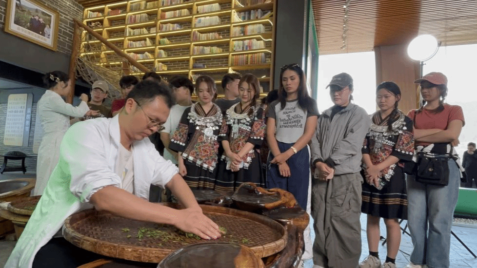 回到制茶室,部分留学生换上民族服饰,师生们一同观看制茶师傅演示杀青、揉捻、干燥等工序,并亲自参与揉捻制茶环节,沉浸在制茶的乐趣中。