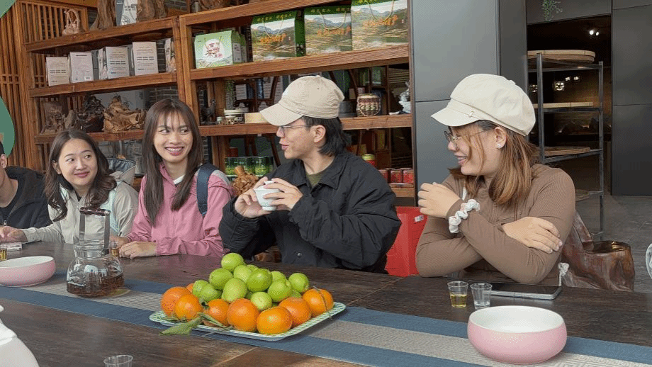 随后,留学生们跟随授课老师体验茶道之美。老师手持茶壶,以娴熟的手法展示了烹茶的全过程。留学生们品着西山茶微苦回甘的独特味道,互相交流感受,茶文化知识学习变得生动鲜活。
