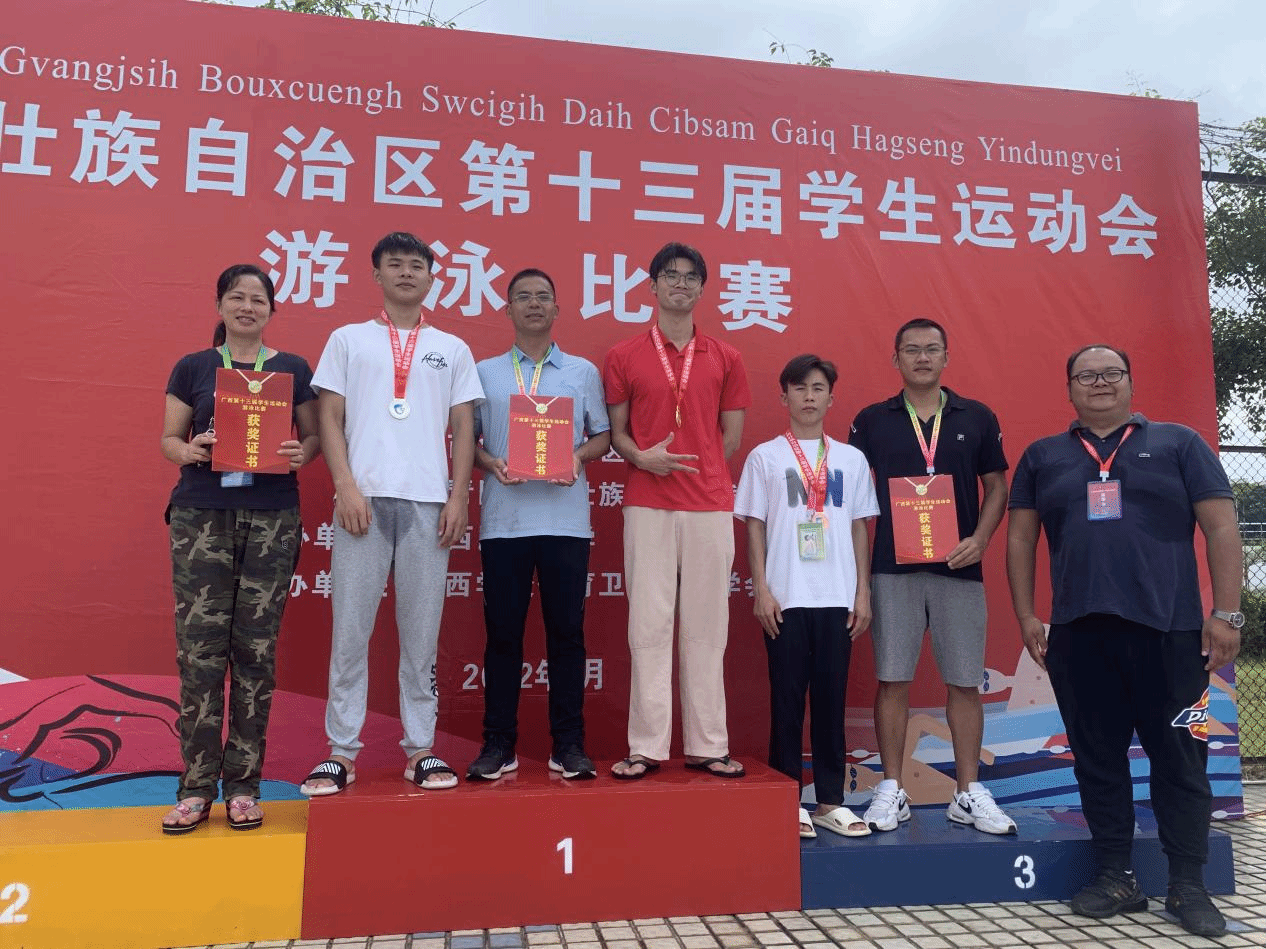 2022年8月,蔡考升同学在广西第十三届学生运动会游泳比赛中取得高职高专男子组100米蝶泳、200米个人混合泳、50米蝶泳三个赛项的冠军,成为学校办学3年来学生参加省级赛事诞生的首位三冠王。