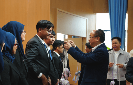 随后,与会领导为马来西亚师生挂上象征吉祥、友谊与祝福的壮族彩色绣球,传递“山水相依、心手相连”的美好寓意。