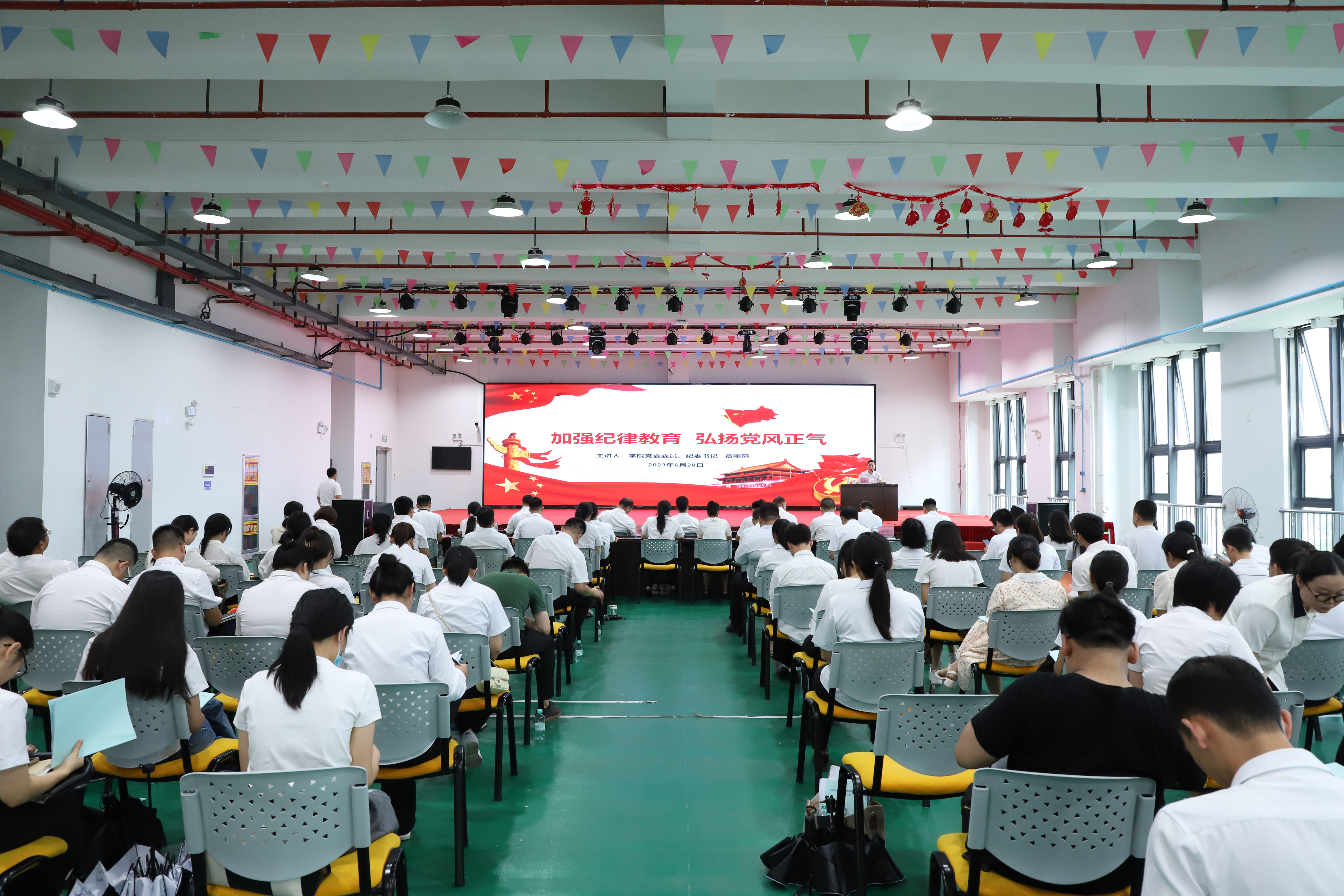 为引导广大党员自觉增强党性修养,强化作风建设,筑牢纪律底线,提高廉洁从业意识,6月28日下午,学院党委委员、纪委书记覃丽燕以“加强纪律教育 弘扬党风正气”为主题,为全体党员讲授一堂纪律教育专题党课。学院党委书记韦光茂带领班子成员及全体党员现场聆听党课。