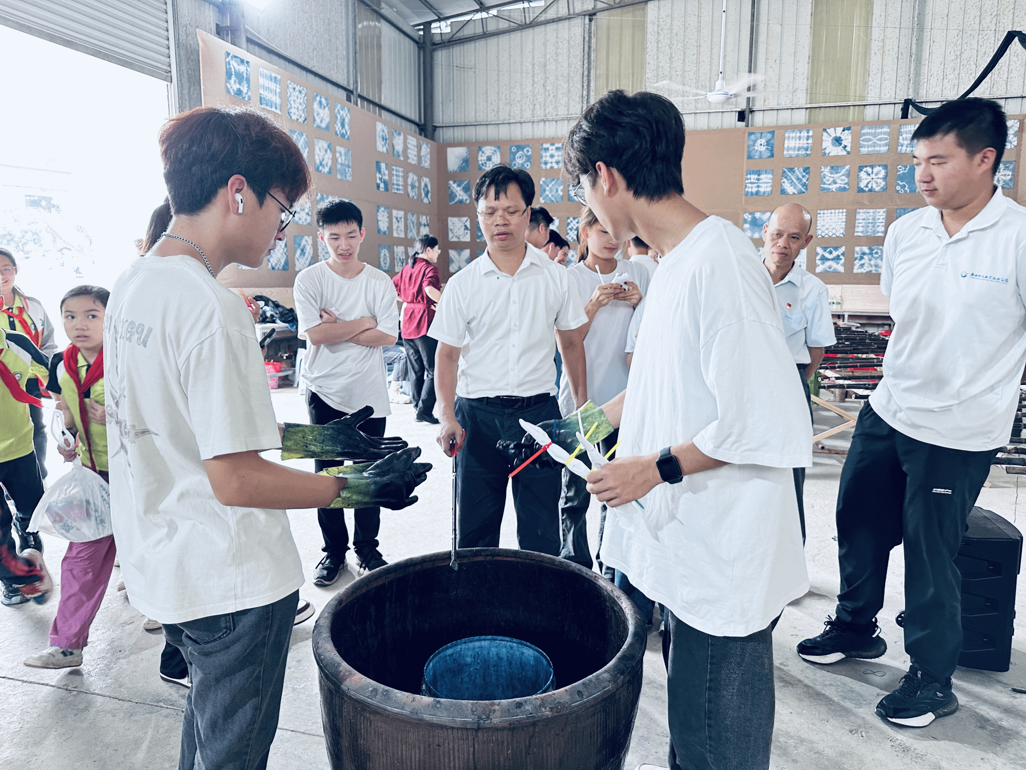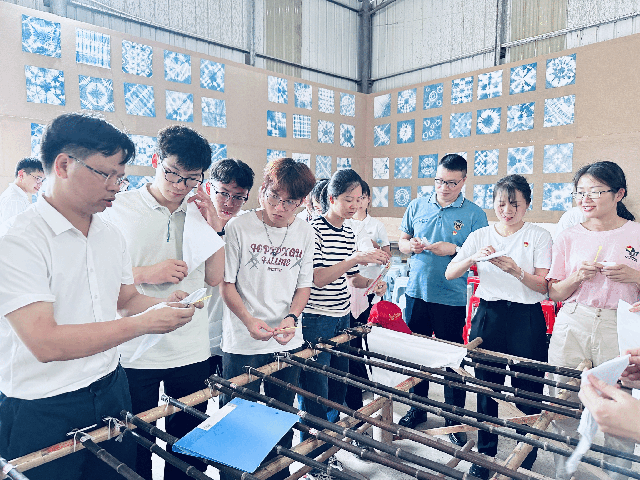 在东方尚贤非遗研学基地,负责人韦军民介绍了油纸伞、宫灯的非遗毛竹手工编制技艺以及扎染的传统技艺,全体人员参观了工厂工艺和宫灯展厅,直观了解非遗毛竹编制工艺之美,同时还现场体验了一把“扎染”。