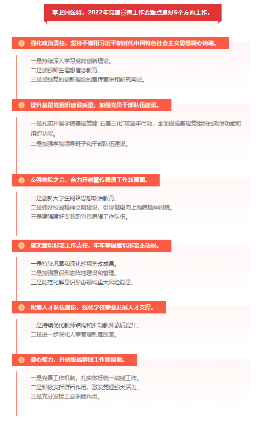 李卫国指出,2021年,学院党委深入学习习近平新时代中国特色社会主义思想和十九大及十九届历次全会精神,贯彻落实两办印发的《关于推动现代职业教育高质量发展的意见》,认真执行中央关于高校党建工作和意识形态的各项部署,围绕学院“三招一建设”中心工作,发扬“三牛”精神,切实履行管党治党责任,推进了学院平稳健康发展。一是强化理论武装,坚持以习近平新时代中国特色社会主义思想凝心聚魂;二是深化党史教育,以伟大建党精神滋养党员教师初心使命、淬炼党性修养;三是履行好第一责任人职责,发挥基层党组织战斗堡垒作用和党员先锋模范作用;四是建强守牢阵地,讲好物院故事;五是加强舆论引导,抓牢抓实意识形态工作;六是坚持党管人才,实施人才强校战略;七是加强统战和群团工作,凝心聚力共谋发展。
