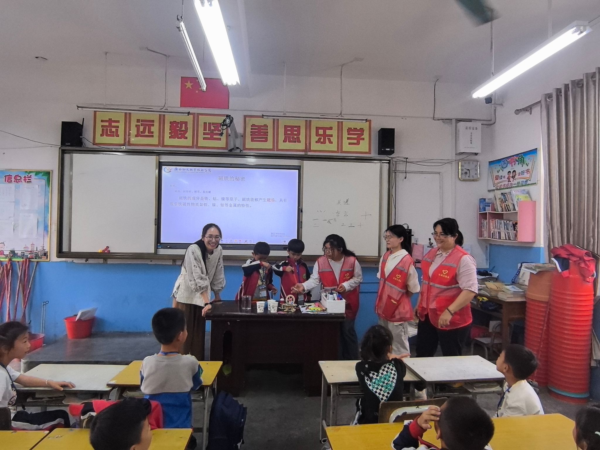 与此同时,高年级的教室则化身为探索科学的殿堂。科学家精神宣讲环节,主讲老师绘声绘色讲述黄大年、魏乃文事迹,点燃孩子们理想之火,传递爱国钻研精神,还巧妙融入磁铁原理等趣味实验,课堂秒变探索乐园。孩子们眼睛放光,抢着上台,沉浸在科学魅力中。