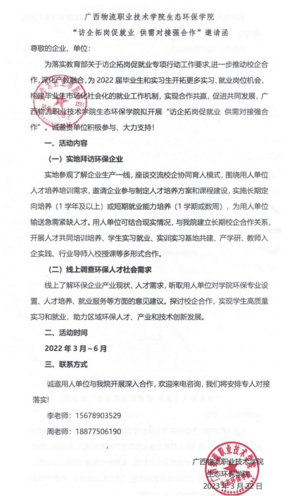 为深入贯彻党中央、国务院关于高校毕业生就业工作的决策部署,落实“访企拓岗促就业”专项行动,加强学院人才培养建设,广泛开拓毕业生就业渠道,提升人才培养质量和学生就业质量,加强校企合作、推进产教融合,促进学生高质量就业,3月24日,学院副院长陈赋光带队前往广西诚瑞生态环境工程有限公司、广西旭森检测技术有限公司进行走访并举办座谈会。生态环保学院党支部书记、副院长许艺馨,环境工程技术教研室教师参加活动。