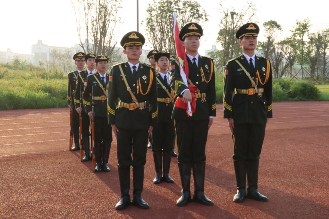 在清晨第一缕朝阳的沐浴下,在全体师生的注目礼下,英姿飒爽的国旗护卫队队员们护送鲜艳的五星红旗进场,行礼完毕,伴随着庄严的《中华人民共和国国歌》,五星红旗冉冉升起,迎风飘扬。在场的每一个人向国旗行注目礼,深怀对祖国无限的热爱和崇高的敬意。