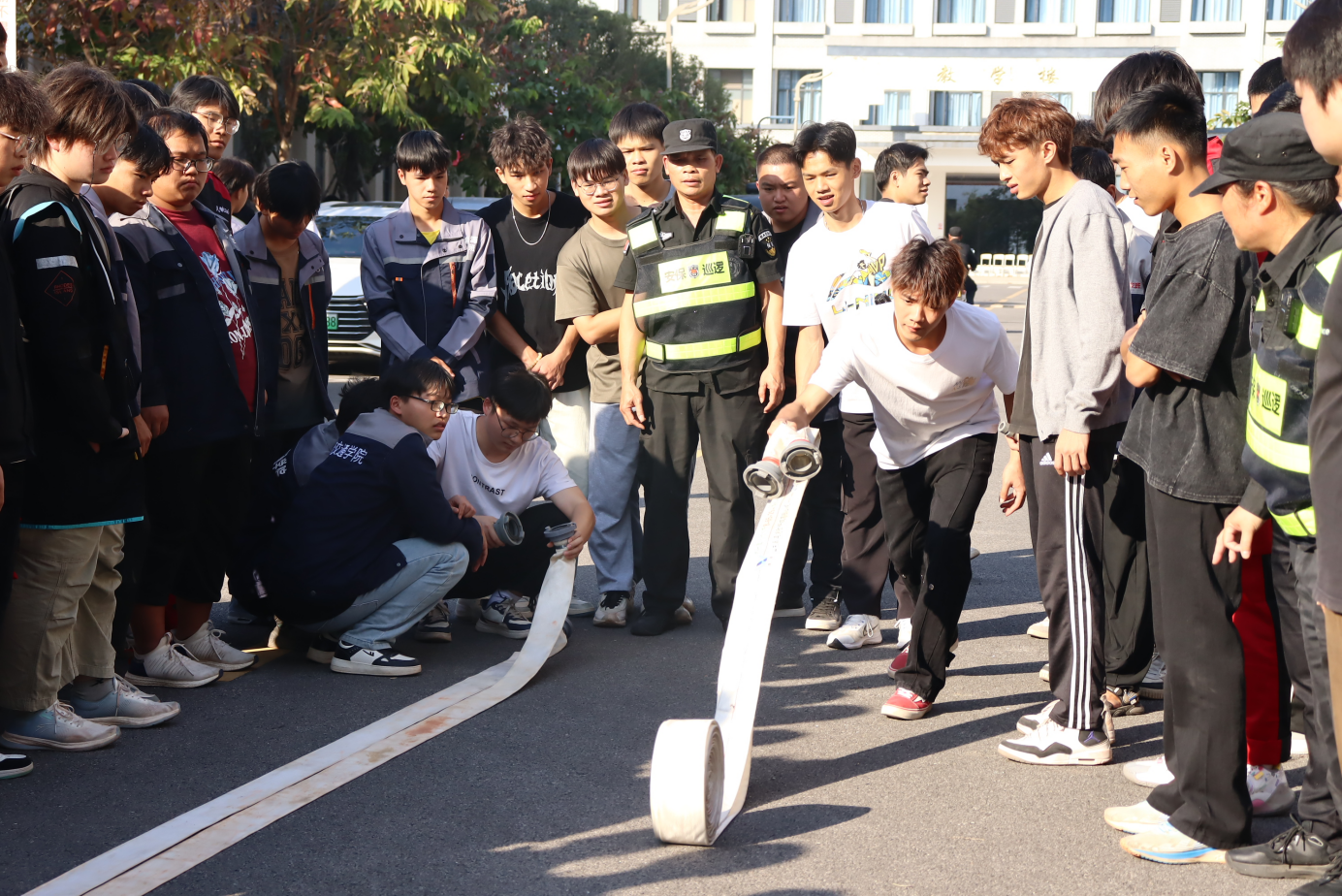 正确使用消防水管,并现场操作使用,随后同学们展开操作训练。