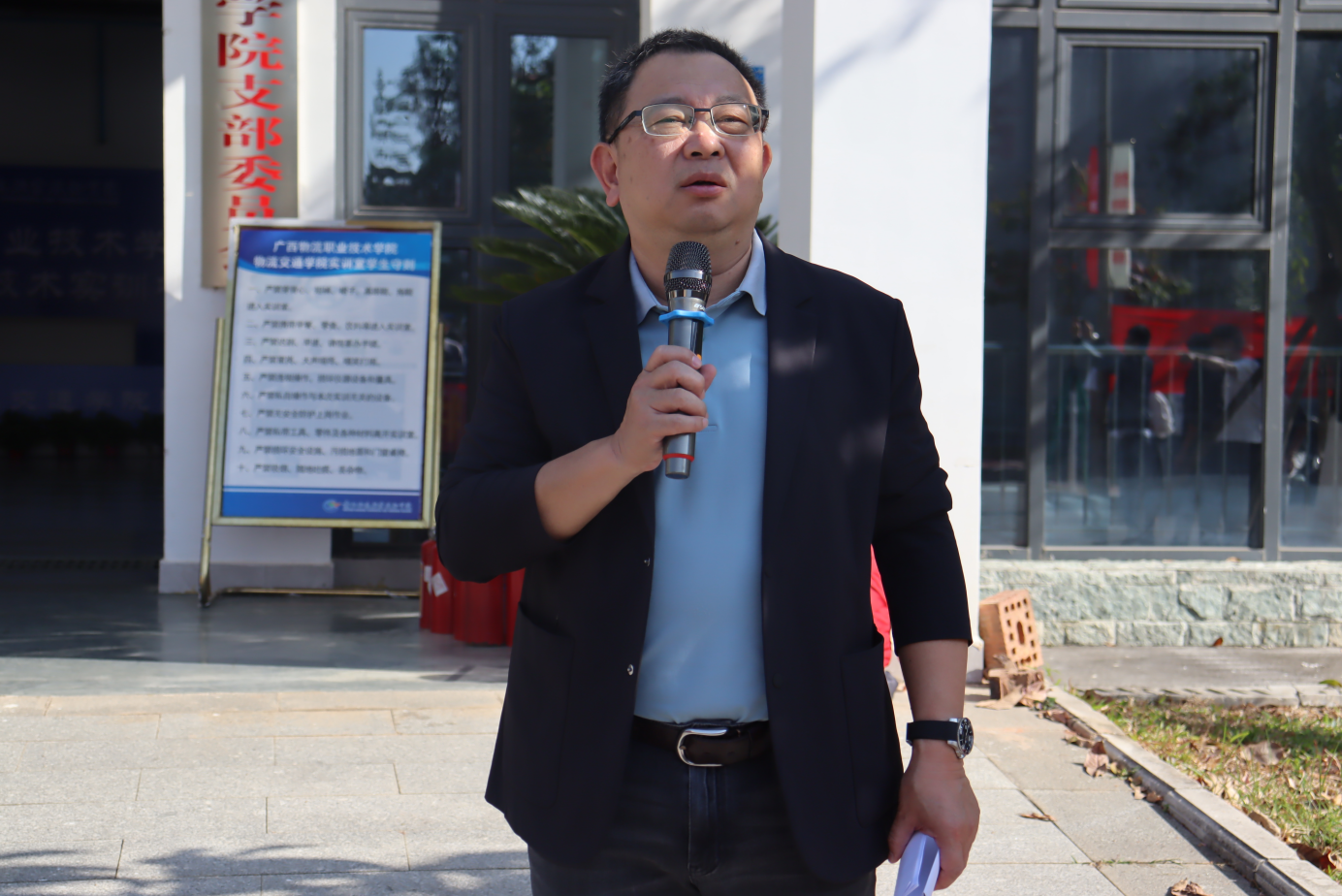 楼开展消防安全演练活动。后勤管理处副主任韦鲲、物流交通学院党支部书记高成良、物流交通学院院长莫军参加本次活动并讲话。