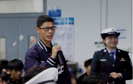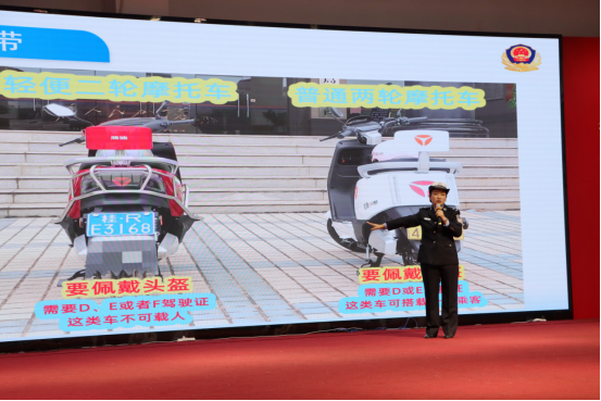 宣讲会现场,民警以一个个震撼人心的事故案例、搞笑心塞的违法视频和别出心裁的普法微电影,用生动易懂的语言将酒驾醉驾、不礼让斑马线、不按规定佩戴安全头盔等交通违法行为造成的危害、涉及的法理娓娓道来。针对高校学生的交通行为特点,详细介绍“小蓝牌”“大蓝牌”“黄牌”等不同类型电动二轮车的区别,叮嘱学生切勿无证驾驶,牢记戴好安全头盔;通报近期贵港市公安交警部门突击整治“飙车炸街”严重违法行为的战果,科普大货车盲区知识,警示学生提高安全防范意识,珍爱生命和自由,自觉杜绝交通违法和行为陋习。
