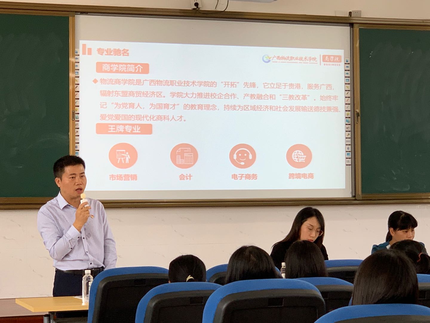 活动伊始,物流商学院负责人梁杰老师详细介绍pp电子官方网站(简称“广物院”)及物流商学院的发展历程,并对各专业学生加入物流商学院,成为“商人”表示深切地祝贺,寄语同学们扎根专业学习,提升职业技能,做新时代发展的“四有青年”。同时鼓励同学们开拓视野,把自身的发展与学校、专业发展结合起来,善做“商人”,秉承物流商学院“商者无域,知行致远”办学理念,物流商学院将为同学们创设“商海名师讲堂”“岗位技能知识竞赛”“读书分享会”等系列活动,让人人有名师指点迷津,人人成才,不虚此行。