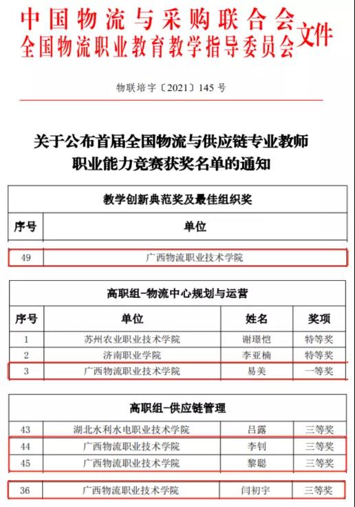此外,还荣获货运代理广西区赛三等奖2项、全国大学生比赛二等奖1项、三等奖2项、全国供应链大赛教师赛三等奖1项。