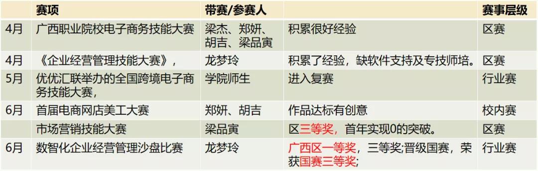 商学院坚持以赛促教、以赛促学、以赛促练的原则推动专业高质量发展,指导教师及参赛学生充分利用课余时间进行专业技能训练,提高职业技能竞赛能力,加深对专业学习与技能训练的融合认识。在各团队的共同努力下,各层级赛事得以顺利进行,并取得第十七届全国职业院校数智化企业经营沙盘大赛全国总决赛三等奖、广西职业院校技能大赛《市场营销技能》三等奖的好成绩。