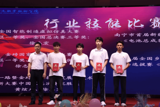 杨一笔、莫军为获得广西职业院校技能大赛奖项的同学们颁奖