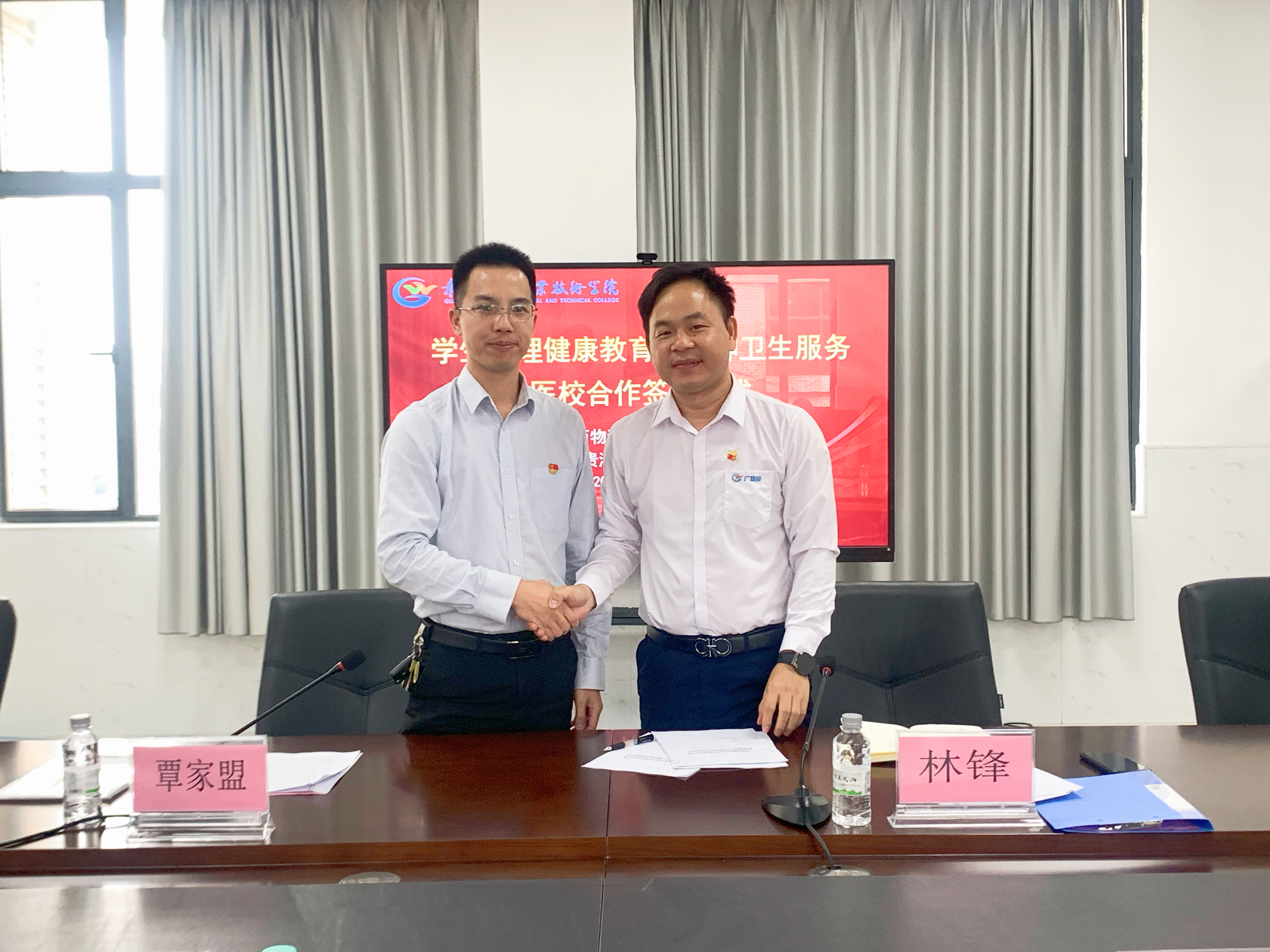 会上,在心理健康教育干事潘露瑶解读医校合作心理危机转介内容及流程。林锋和覃家盟共同签署了协议书。