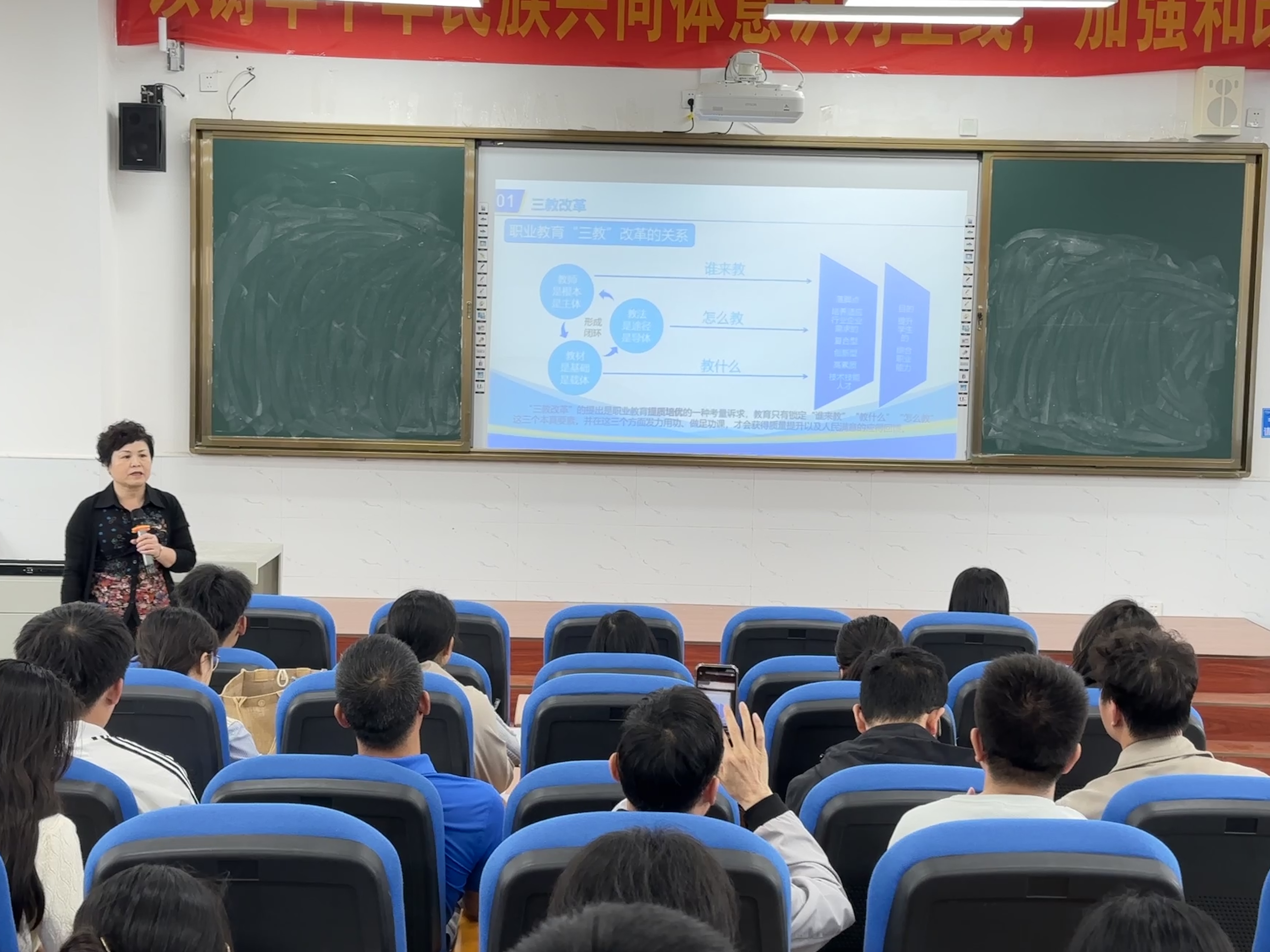 粟景妆教授围绕“教师、教材、教法”三教展开讲座,“三教”的作用体现为教师是主体、教材是载体、教法是导体。教师是教学活动的组织者和引导者,公共课教师通过在教学活动积极的能动性和创造性,在学校教学活动中同样大有作为;教材是教学的载体,粟教授表示年轻教师认为课难上往往是因为被教材所捆绑,通过选好教材,打破教材繁、偏、旧的取向,将有价值的、能体现职业教育特色知识的教材,呈现为学生学习的依托;教法是教师与教材之间的导体,有效的教学方法能够帮助教师站好课堂教学主战场,提升教学质量并实现培优,也是抓好课堂建设的重要途径。