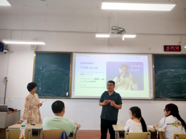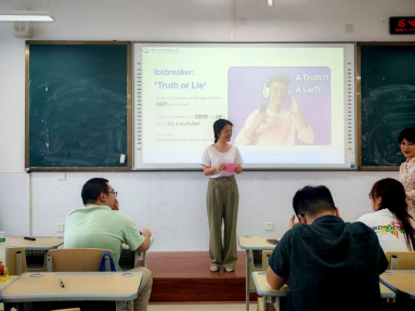 活动一开场,“Truth or Lie”破冰游戏便点燃了教师们的热情。参与者需用英语讲述一段个人经历,其他教师通过犀利提问辨别真伪。“I ran a half marathon yesterday - 21 kilometers!”(我昨天跑了半马21公里),“I used to be a translator for a German pilot in Xiamen.”(我曾在厦门给德国飞行员当翻译)等金句频出,妙趣横生的故事引发阵阵笑声。破冰环节迅速拉近距离,让教师们在"破案式"互动中自然切换英语思维模式。