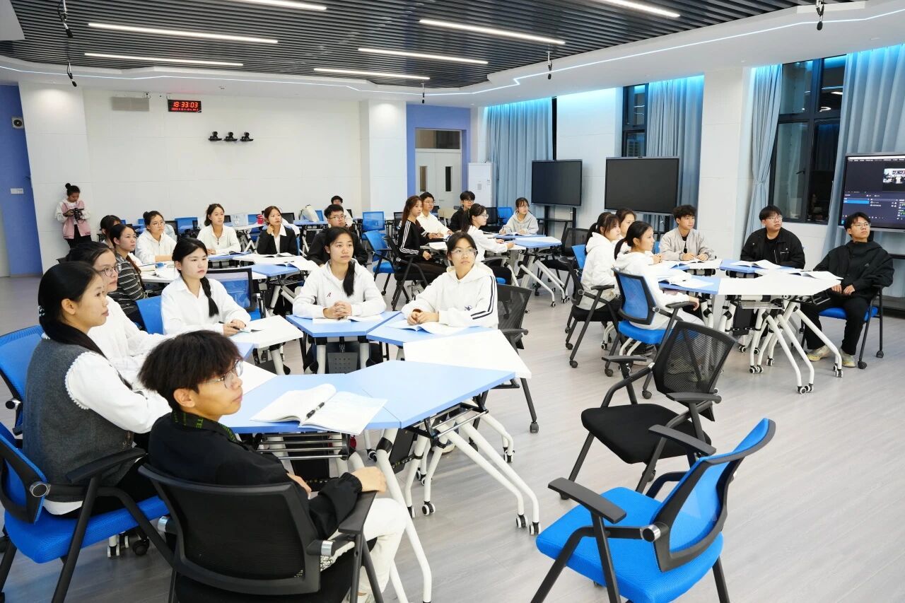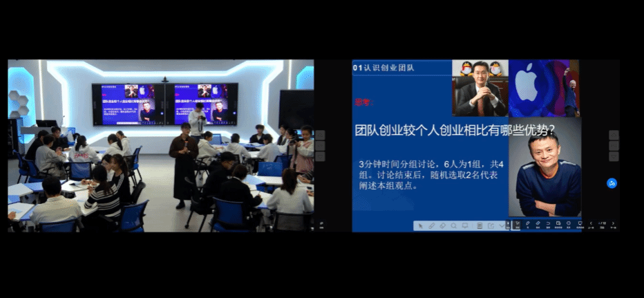 ▲学生代表现场聆听全区同上一门创新创业课系列直播课