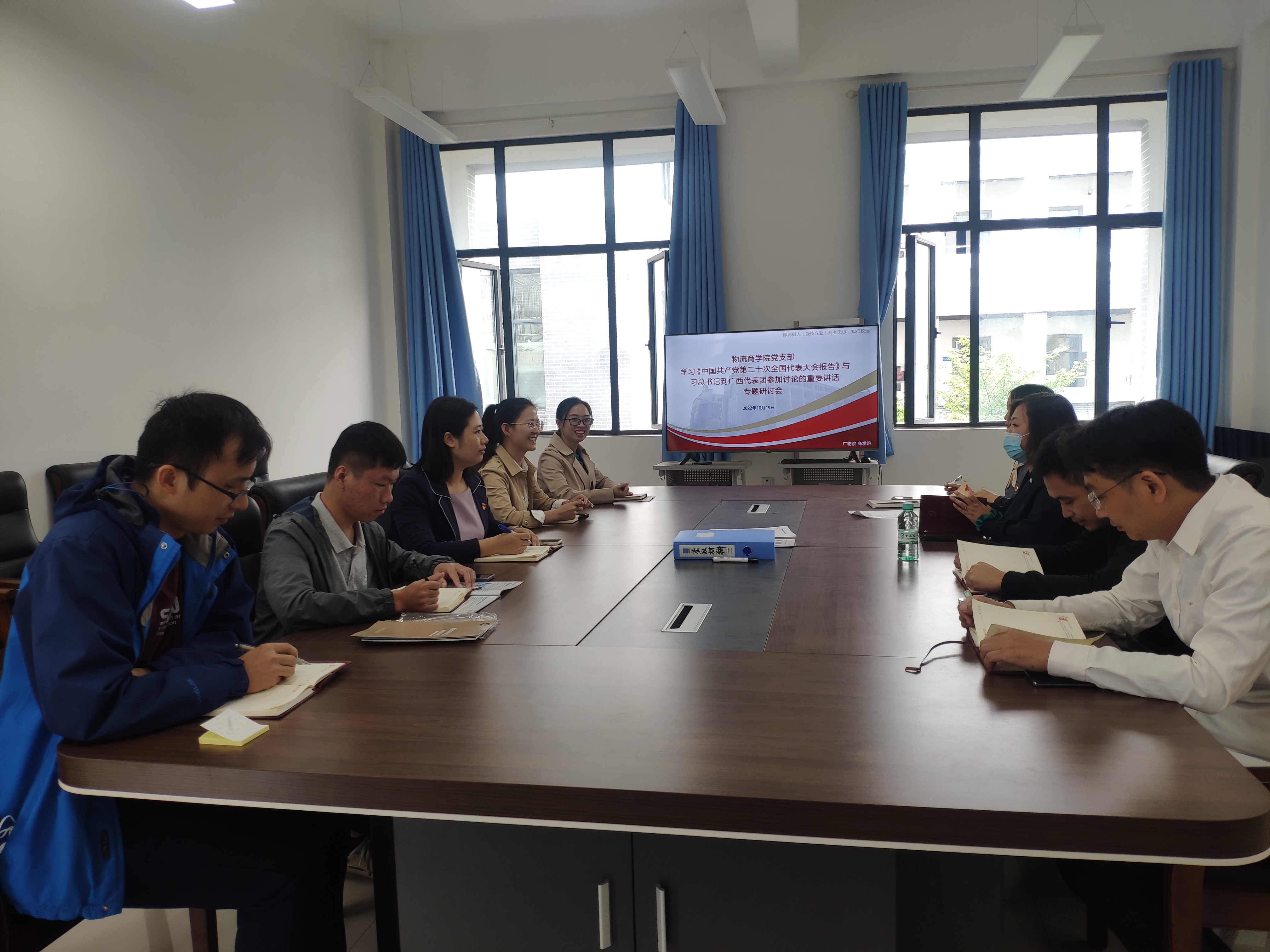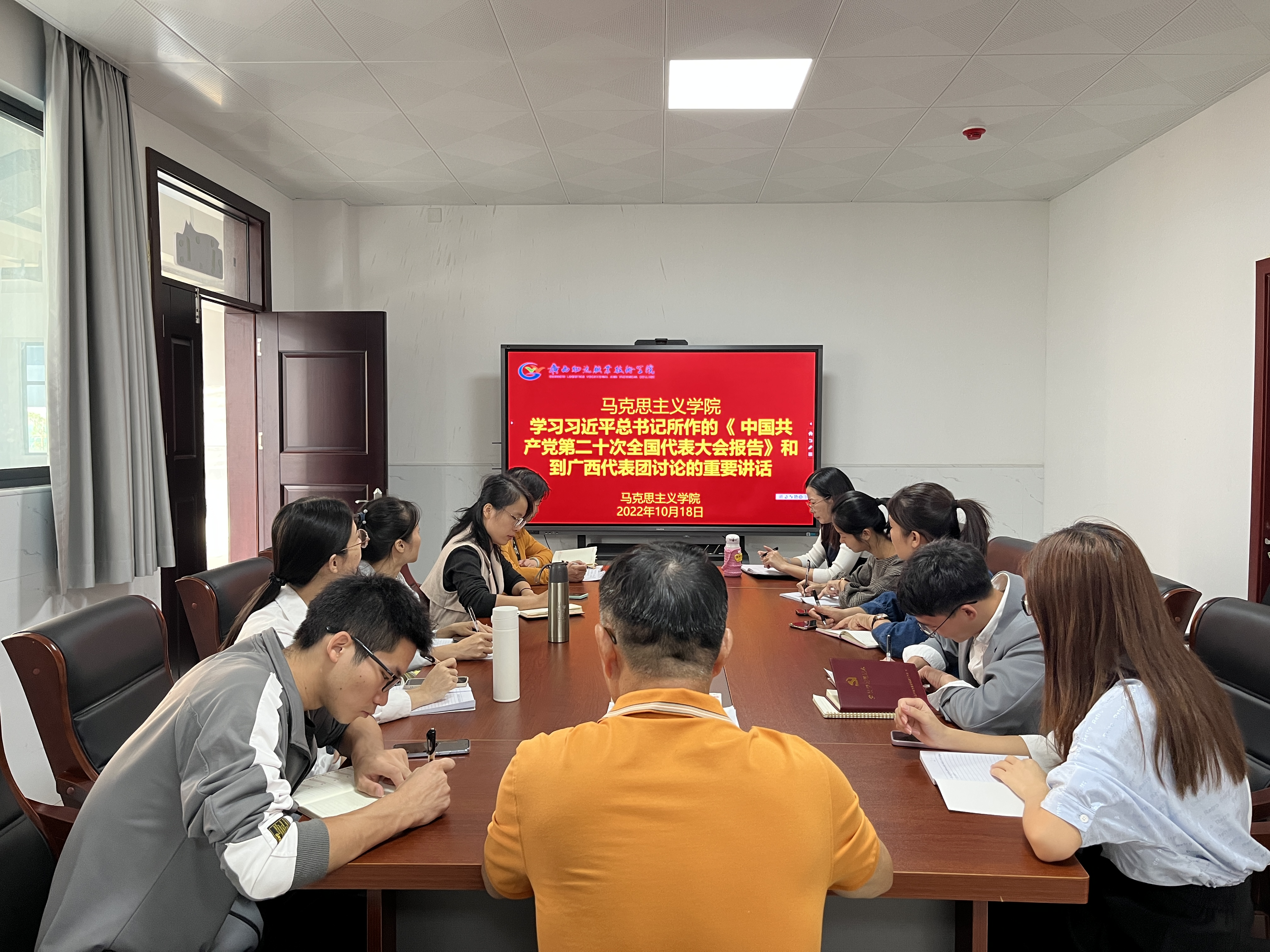 为深入学习贯彻党的二十大报告精神,进一步加强党员干部理想信念教育,自觉做中国特色社会主义共同理想的坚定信仰者和忠实实践者,10月18日-19日,学校各党支部组织开展“学习党的二十大报告精神 奋进新征程”主题党日活动,集体学习习近平总书记在中国共产党第二十次全国代表大会上作的报告和习近平总书记参加党的二十大广西代表团讨论时的重要讲话。